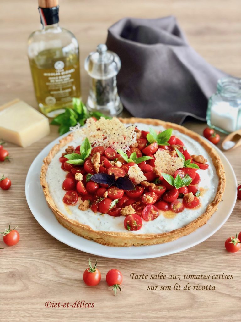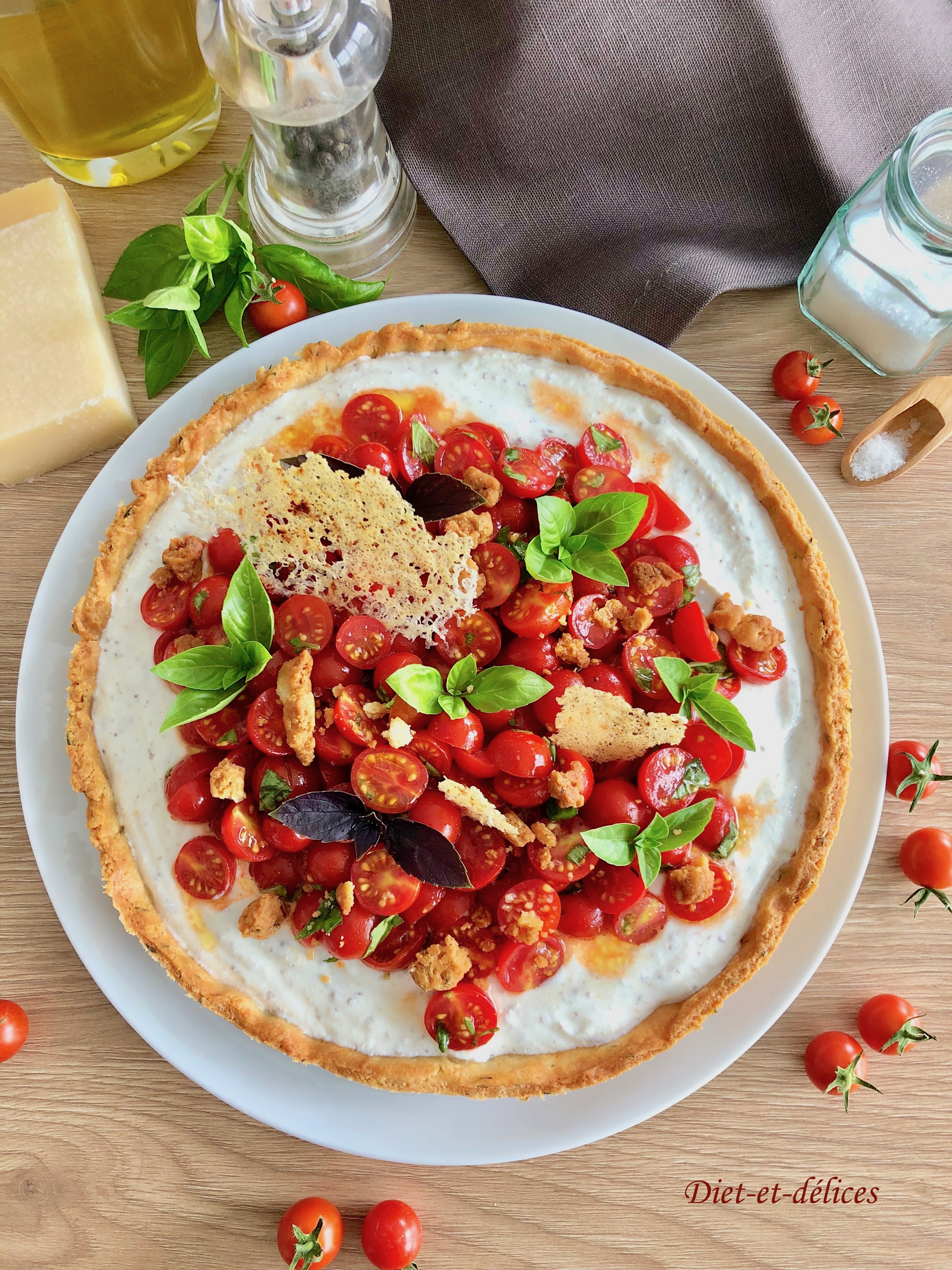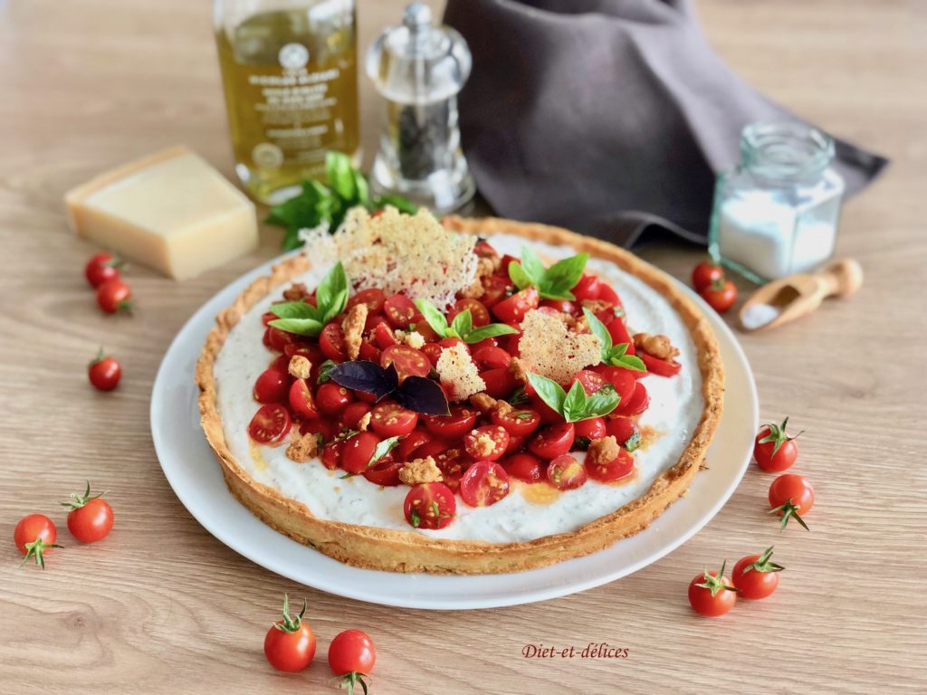 tarte, tarte salée, tomates cerises, tarte à la tomate, ricotta, grana padano, basilic, thym, tomate