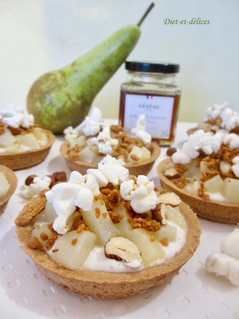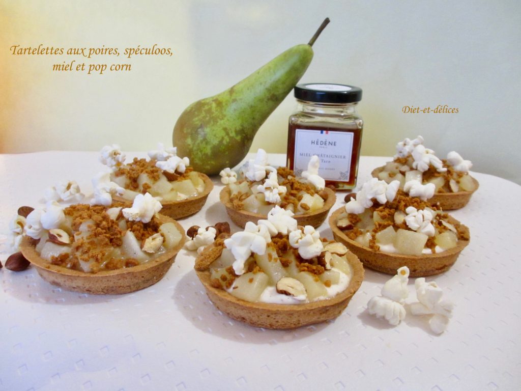 tartelettes, dessert, fromage blanc, tartelettes aux poires, poires, spéculoos, miel, pop corn, miel de châtaignier