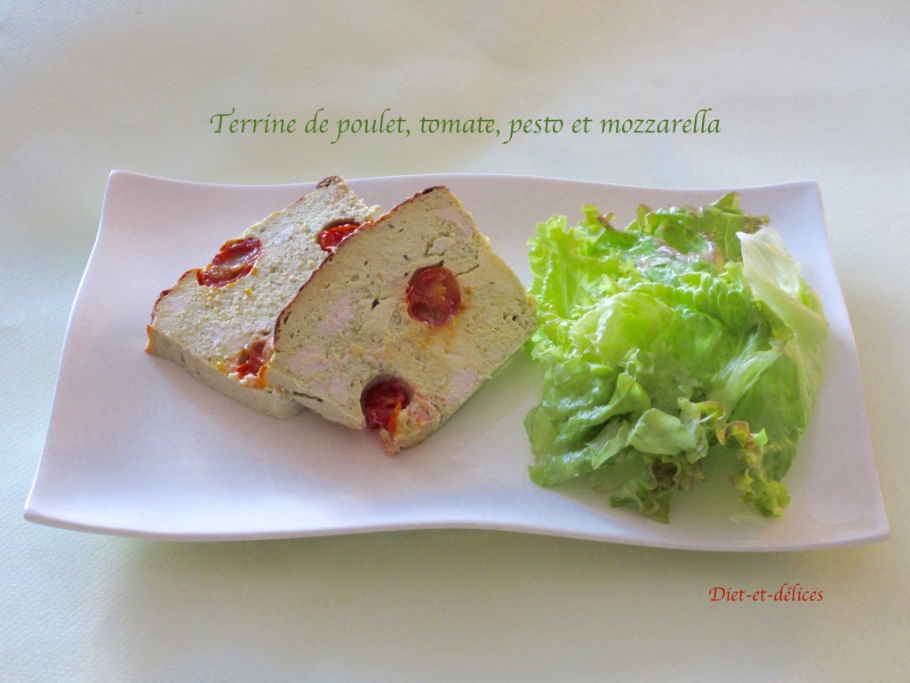 terrine, poulet, terrine de poulet, pesto, mozzarella, tomates, tomates cerises, entrée, entrée froide, filets de poulet, fromage blanc