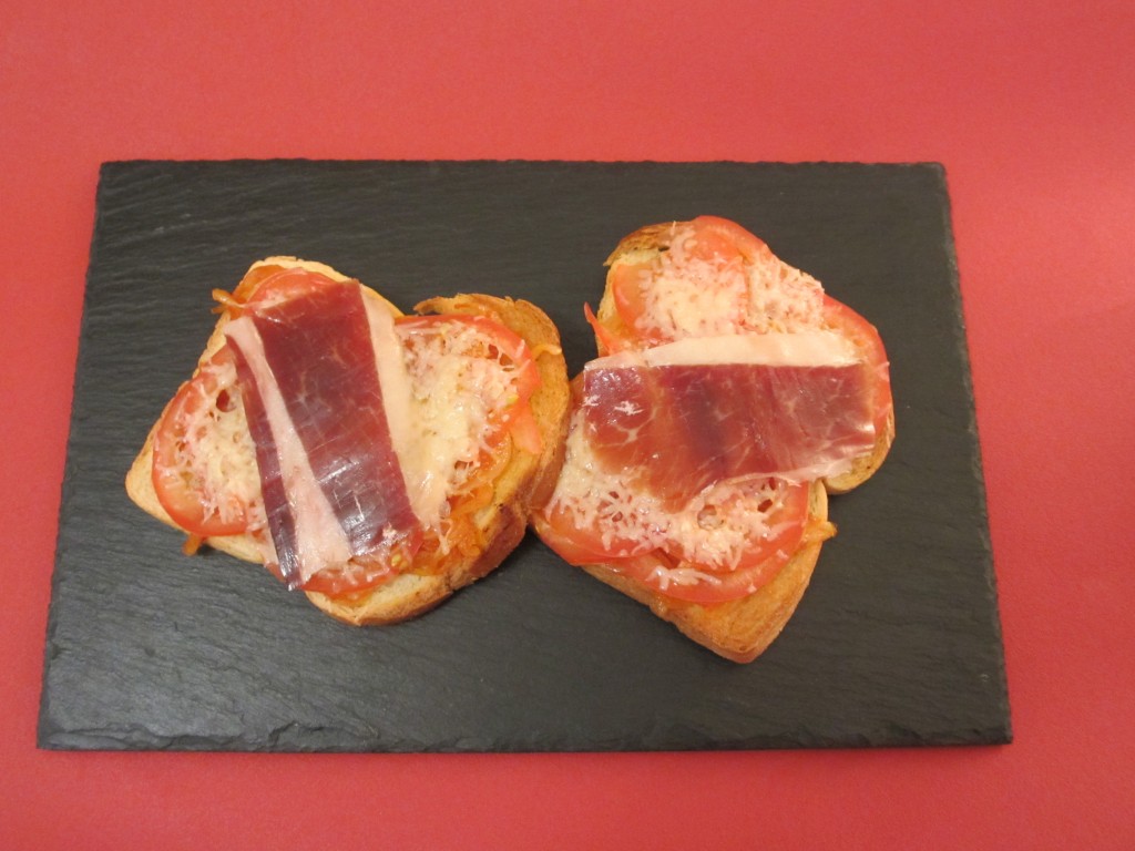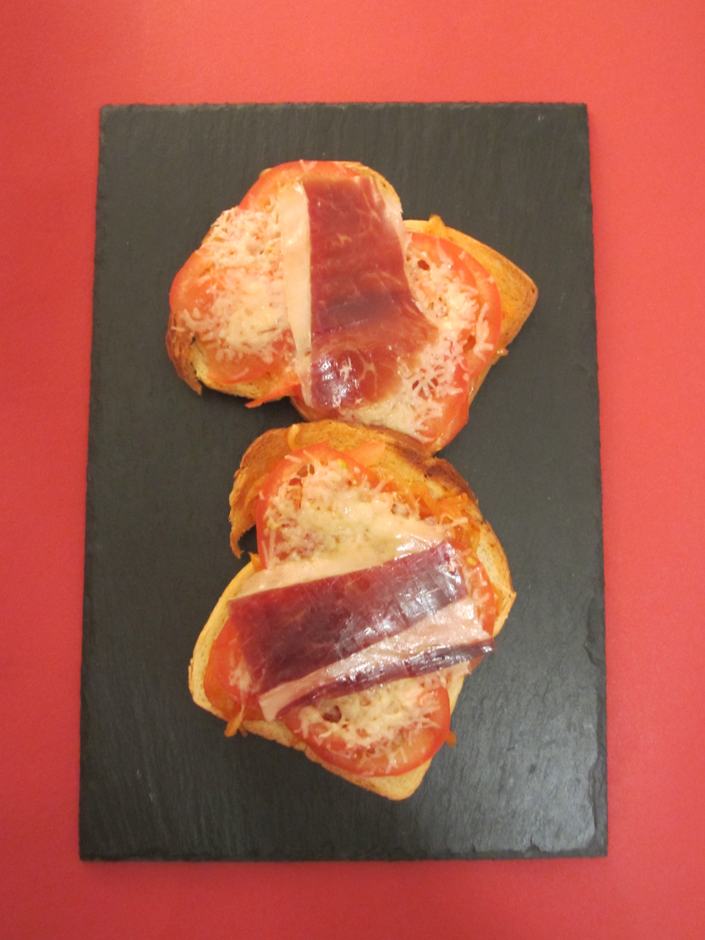 toast, jambon, jambon ibérique, sandwich, apéro, toast au jambon, fêtes, entrée, entrée fêtes, noël, tomates, huile d’olive, ail, oignon, gratiné, toast chaud, canapé