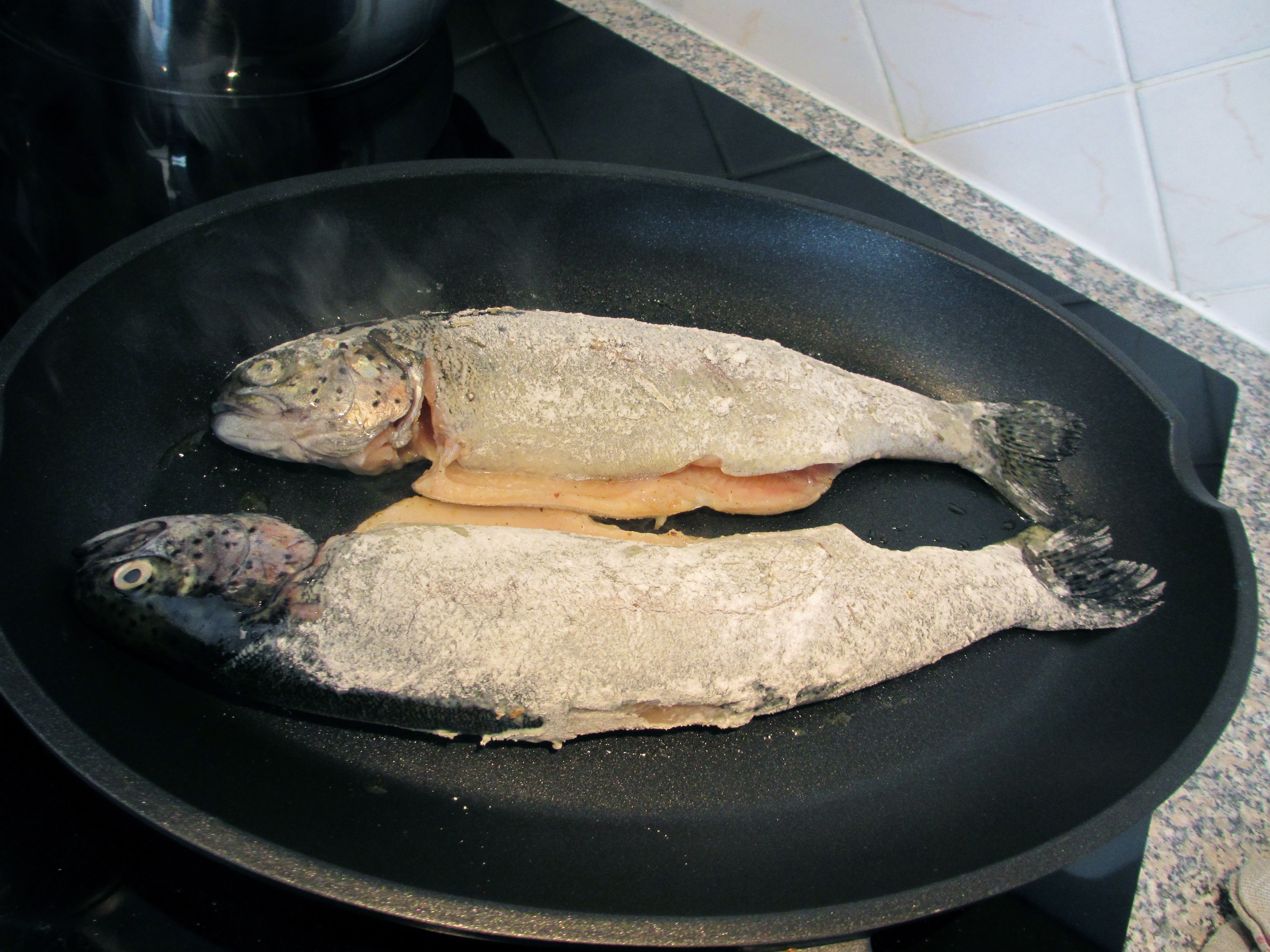 - Faire chauffer l’huile dans la poêle à poisson et y déposer les truites. Les faire revenir 5 minutes sur chaque face.