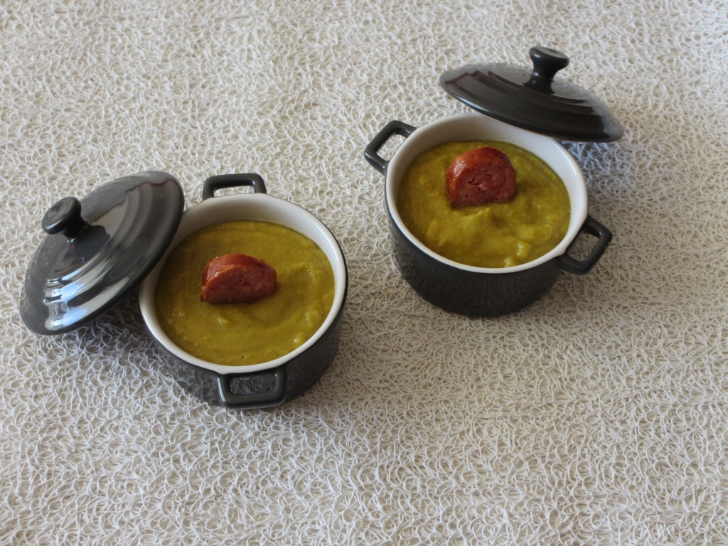 - Enlever la peau d’une des saucisses à cuire,la couper en petits morceaux et les incorporer aux pois cassés.