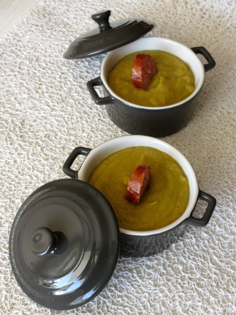 soupe, velouté, potage, soupe de pois cassés, velouté de pois cassés, pois cassés carottes, oignon, bouquet garni, saucisse à cuire, plat d’hiver, plat mijoté