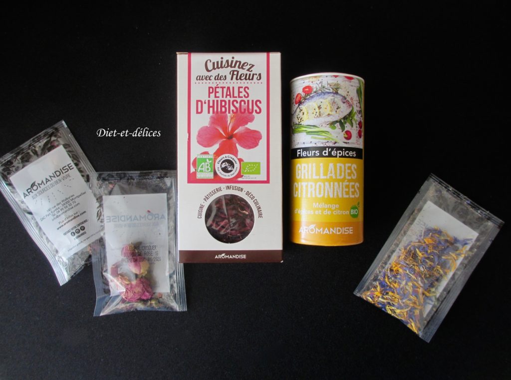 - des fleurs à croquer : bouton de rose, mélange de fleurs (pétales de tournesol, pétales d’hibiscus, fleurs de bleuets et pétales de roses)