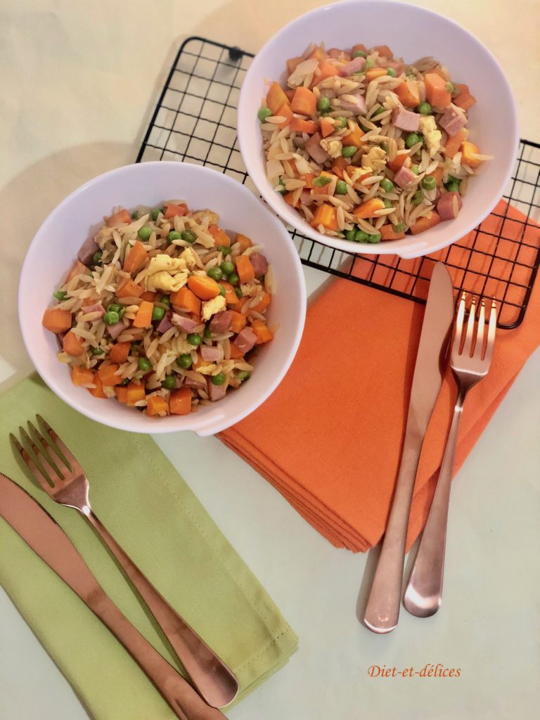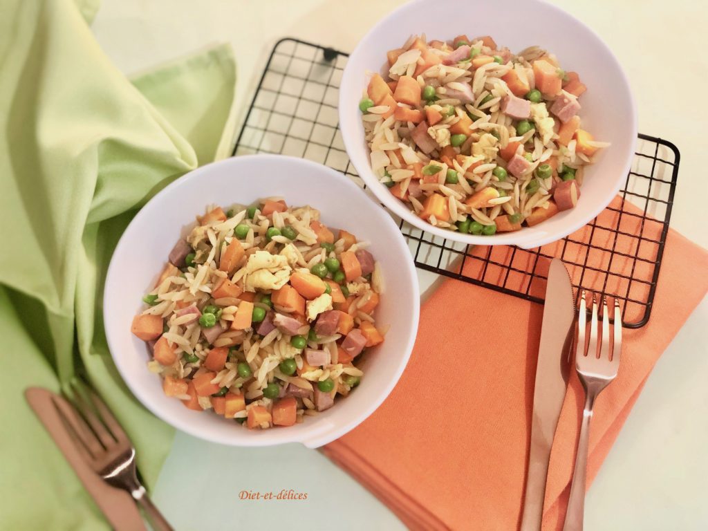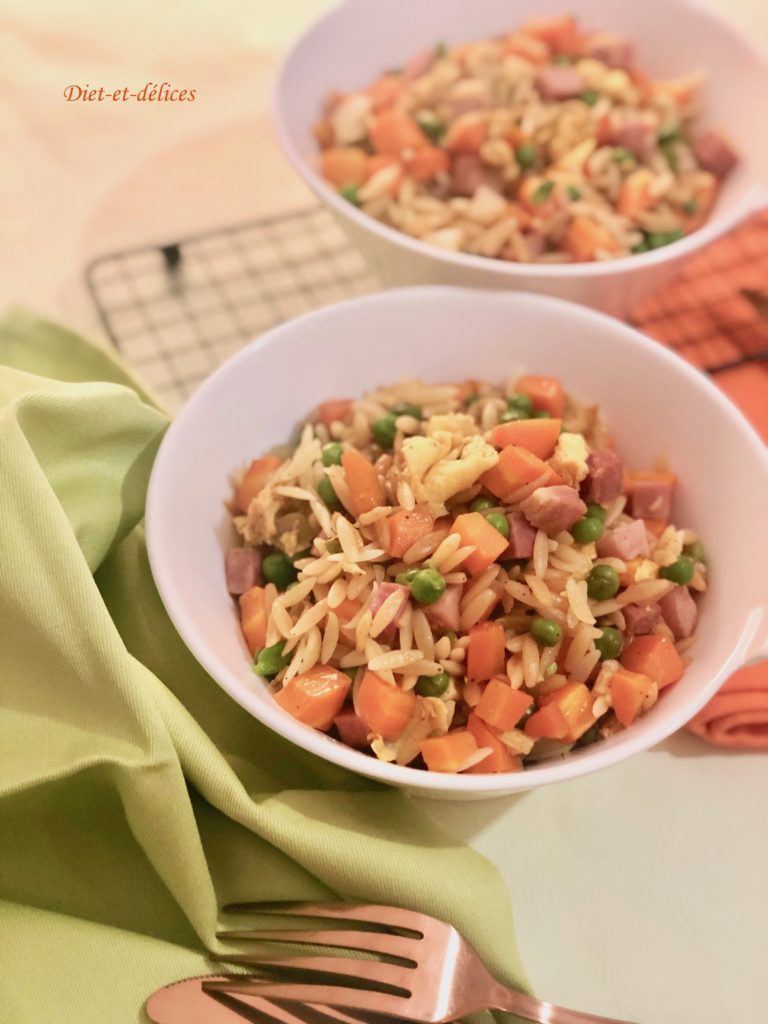 plat complet, pâtes, petites pâtes, avoine, carottes, sauce soja, petits pois, sauce soja, jambon cuit