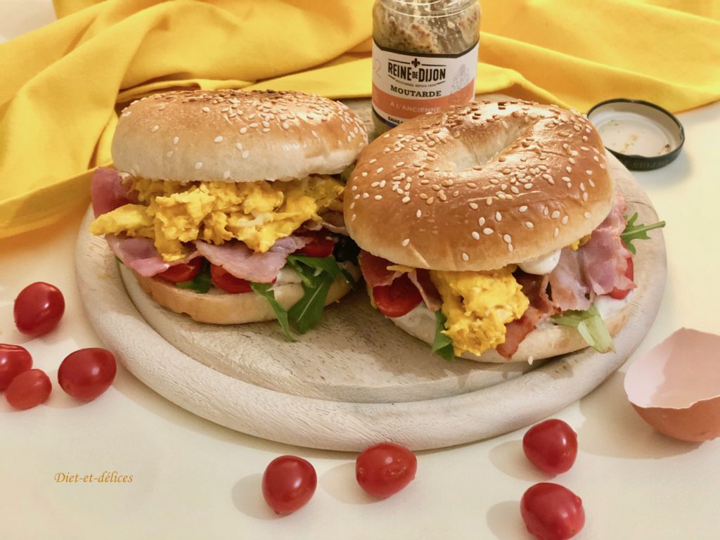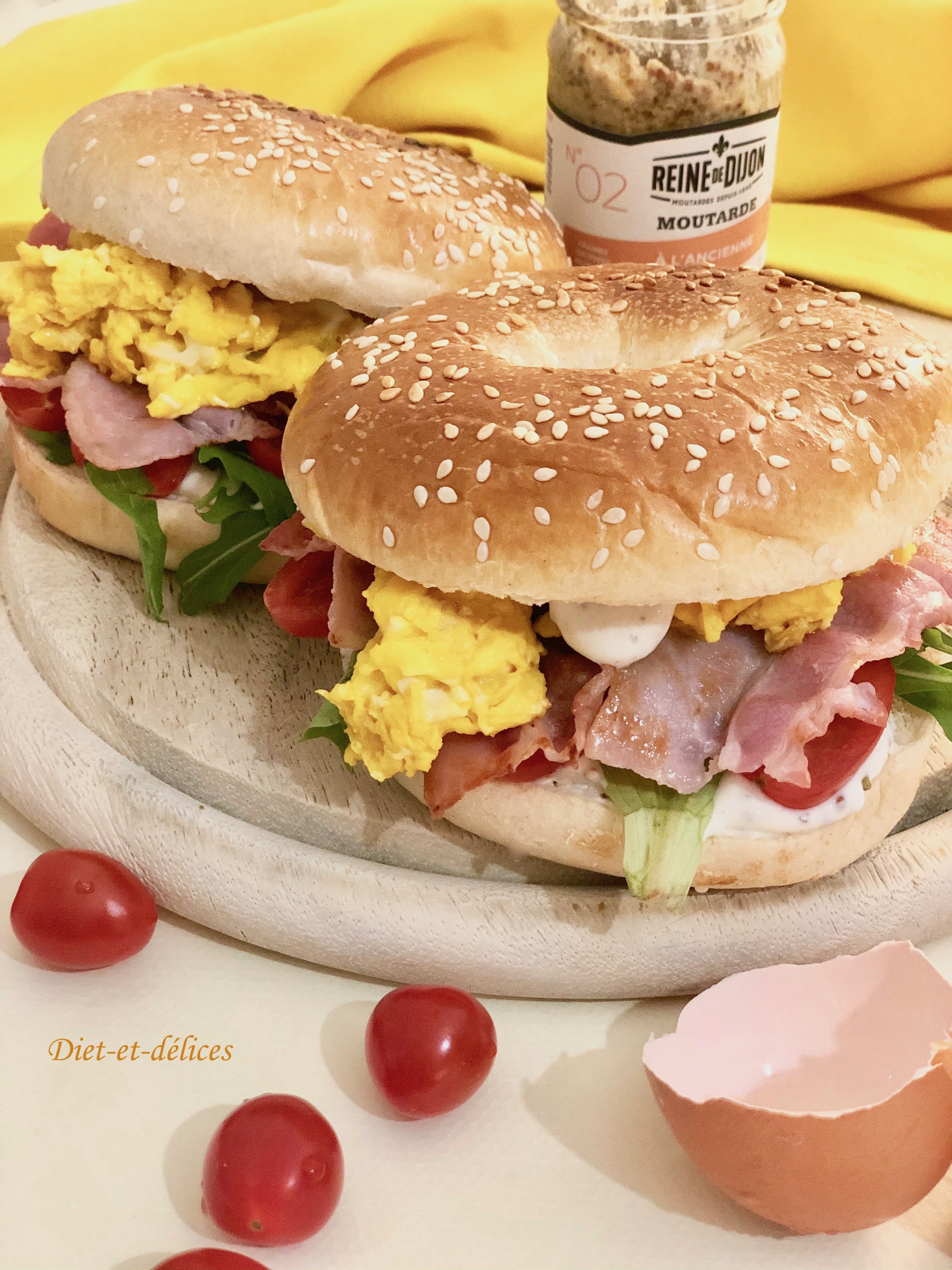 bagel , oeuf, bacon, bagel oeuf bacon, oeuf brouillés, moutarde, sandwich, fromage blanc, plat complet