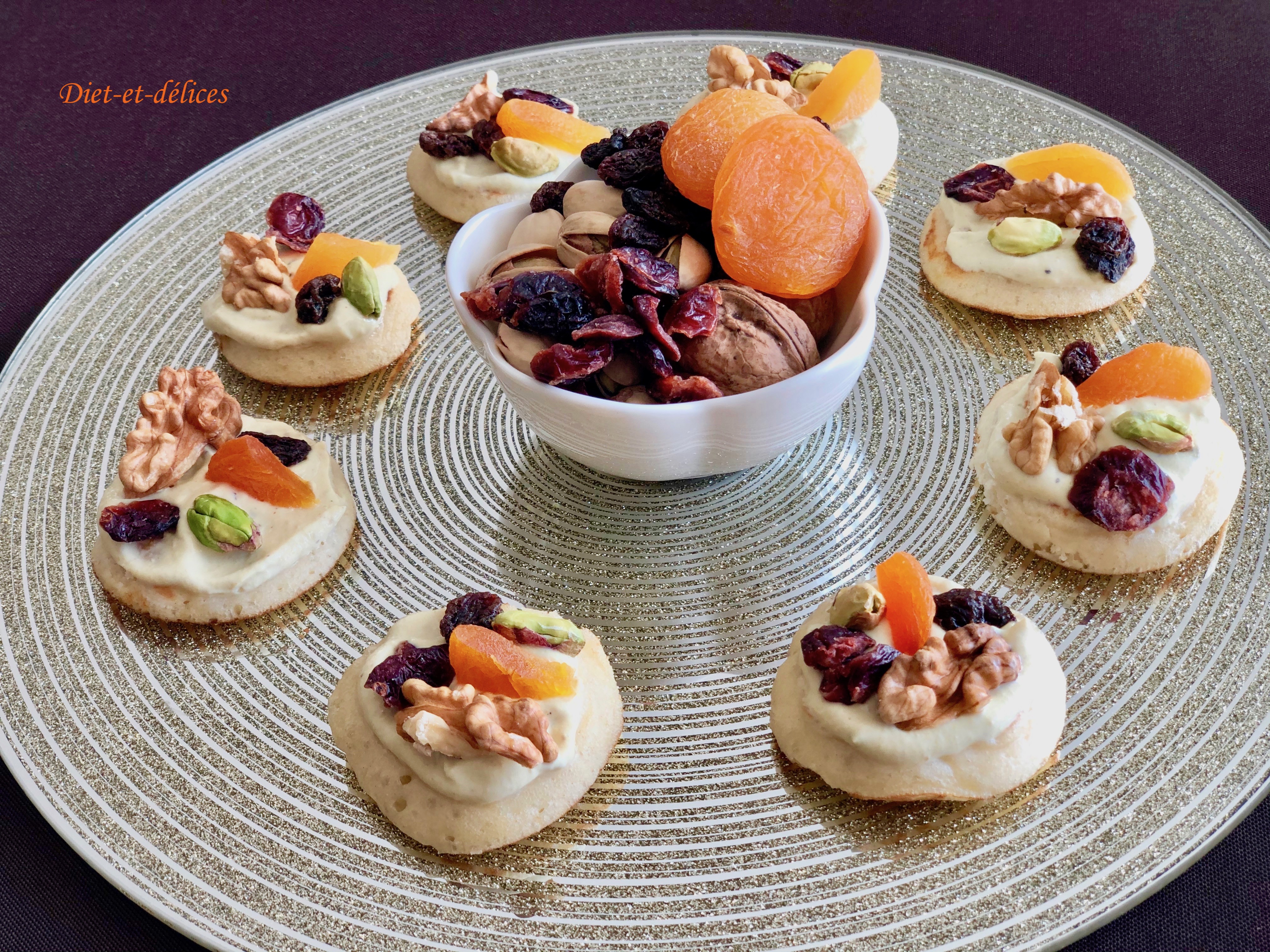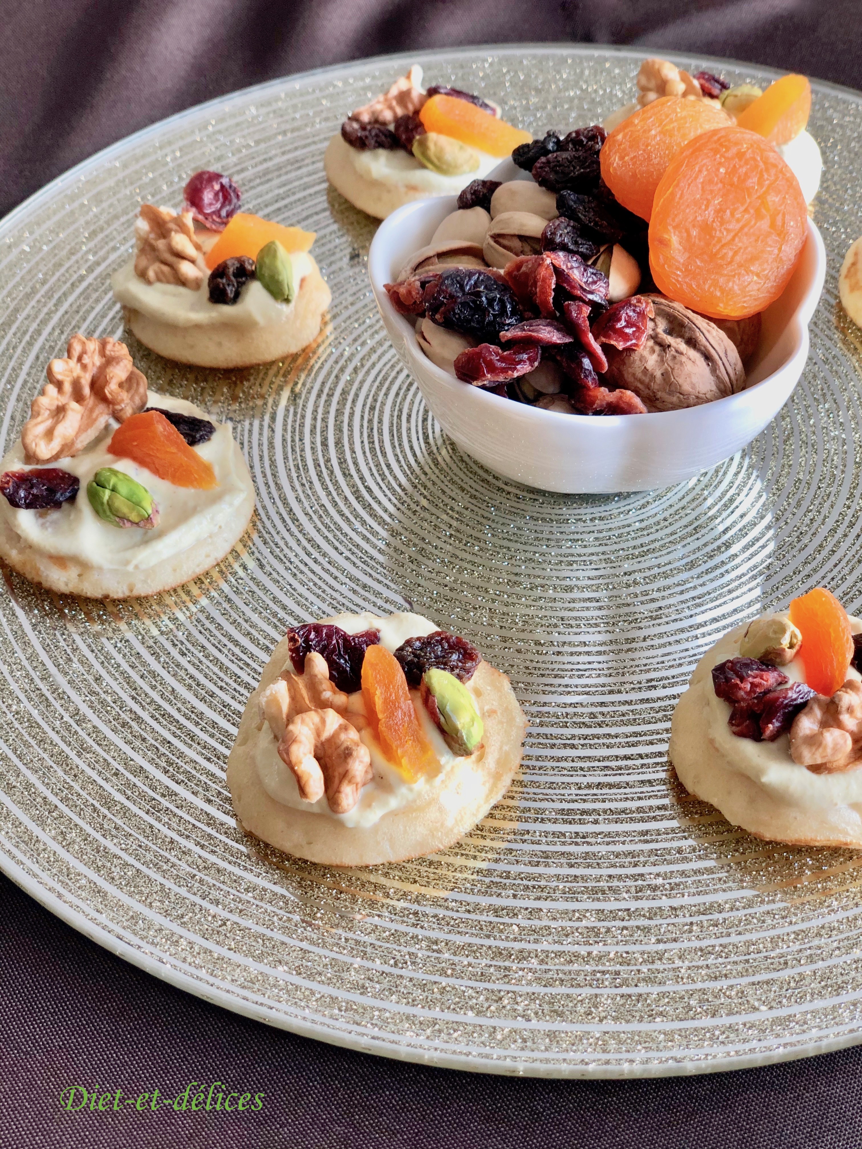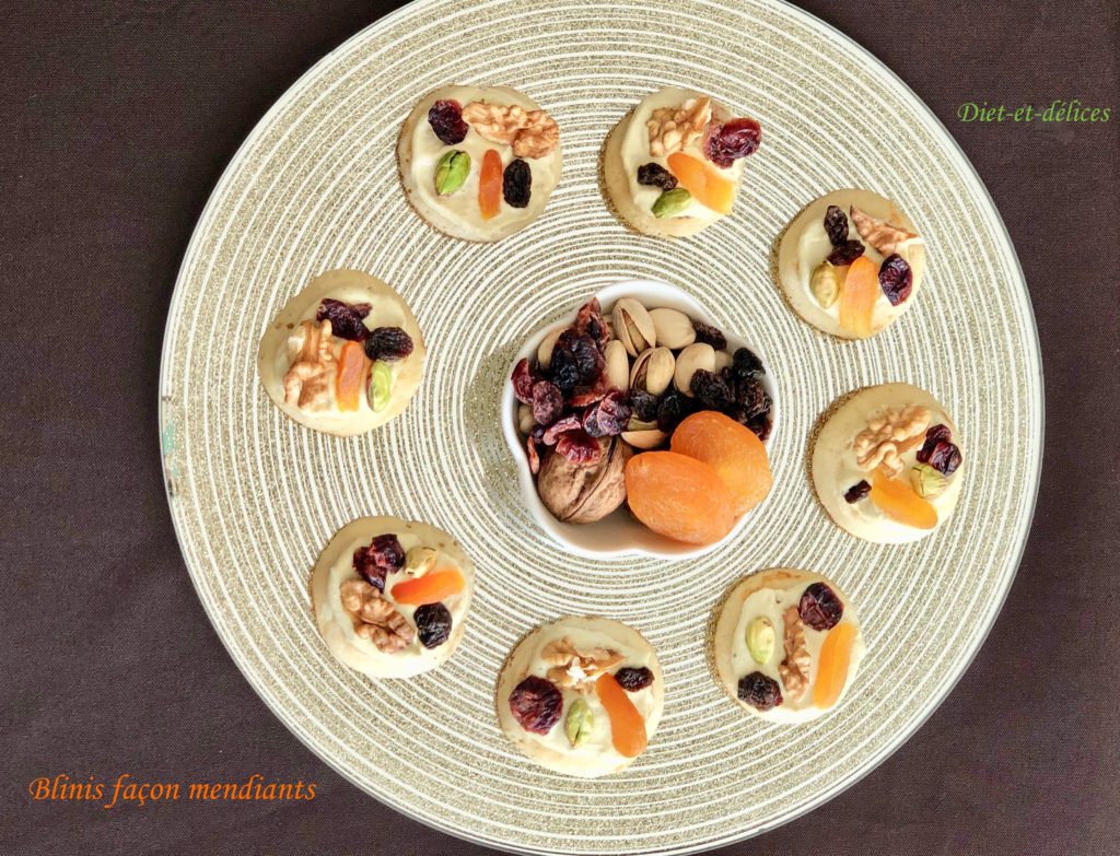 apéro, blinis, fromage blanc, moutarde, mendiant, abricot sec, pistache, cranberries, noix, raisins secs, apéritif