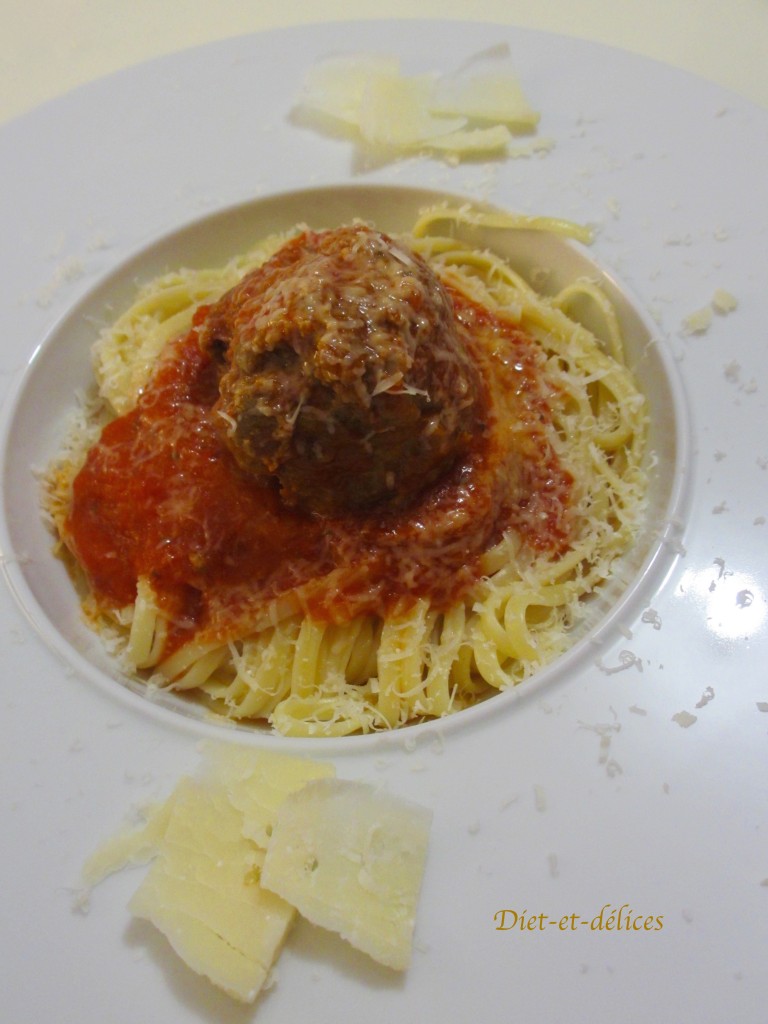 Bien moêlleuses boulettes , et avec pâtes et coulis de tomates maison , super …
