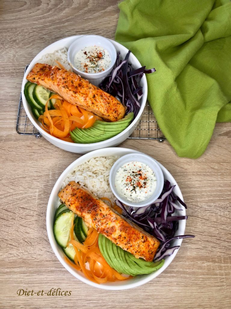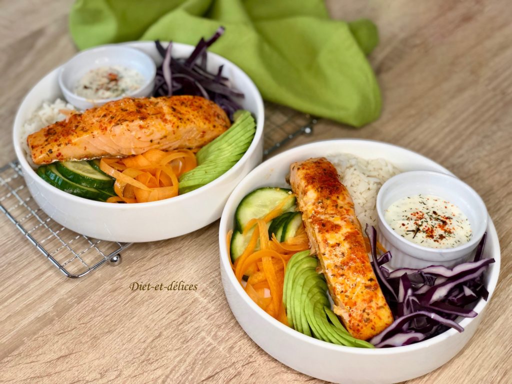 bowl, saumon, cruditéschou rouge, saumon mi-cuit, carotteavocat, concombre, plat complet