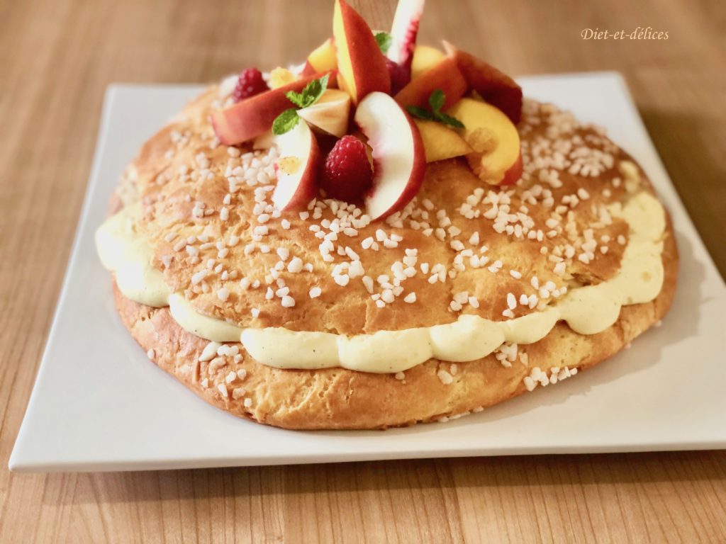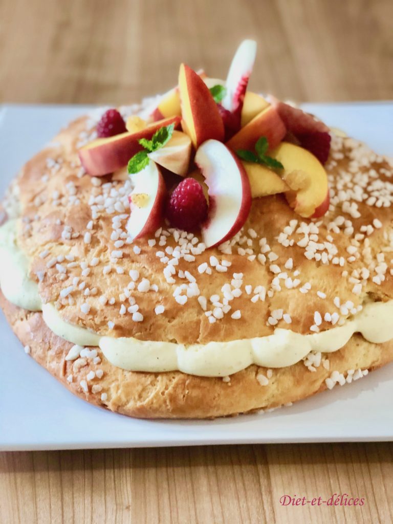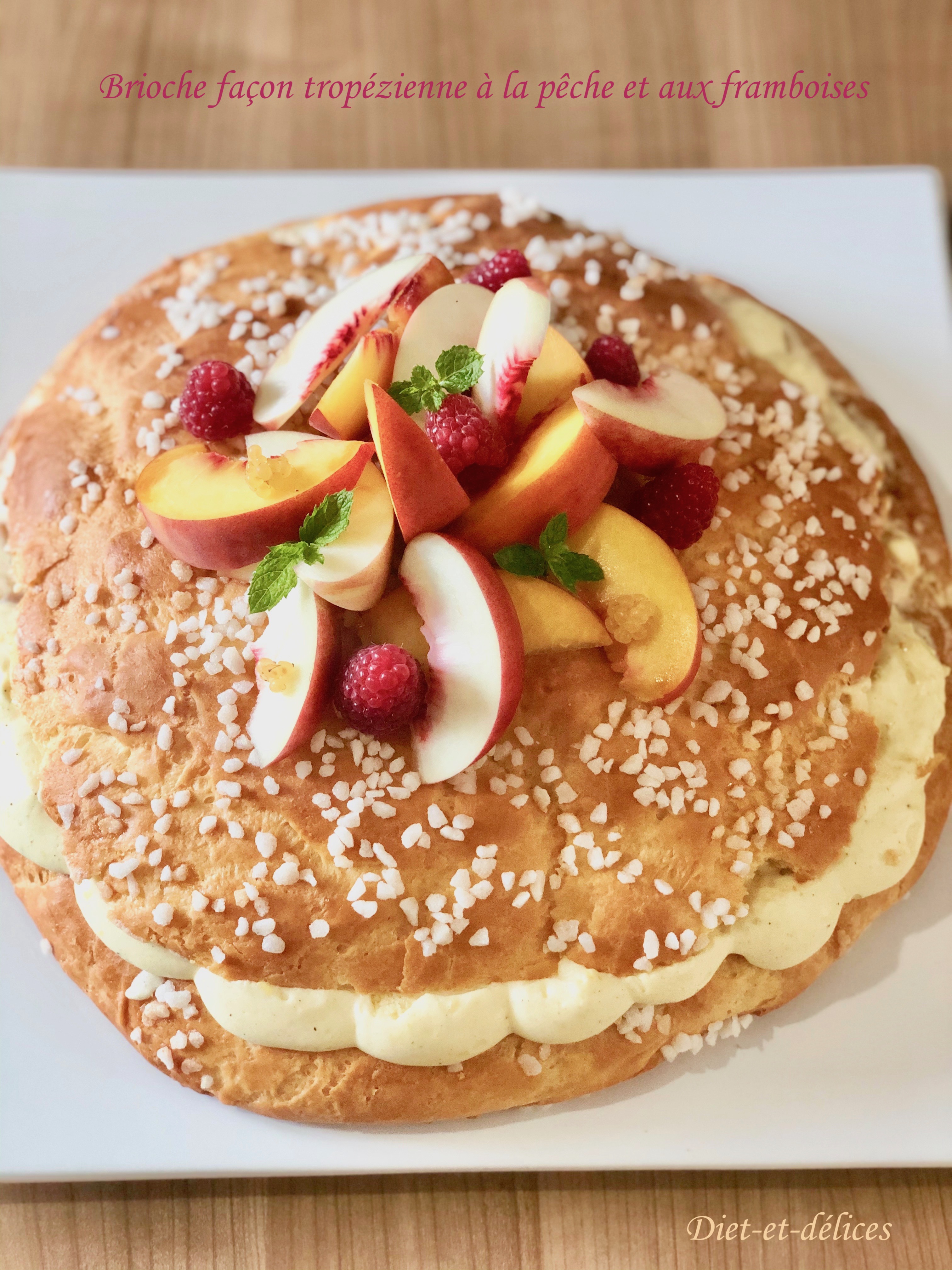 brioche, tropézienne, pêches, dessert, framboises, vanille, sucre perlé, sirop de pêches