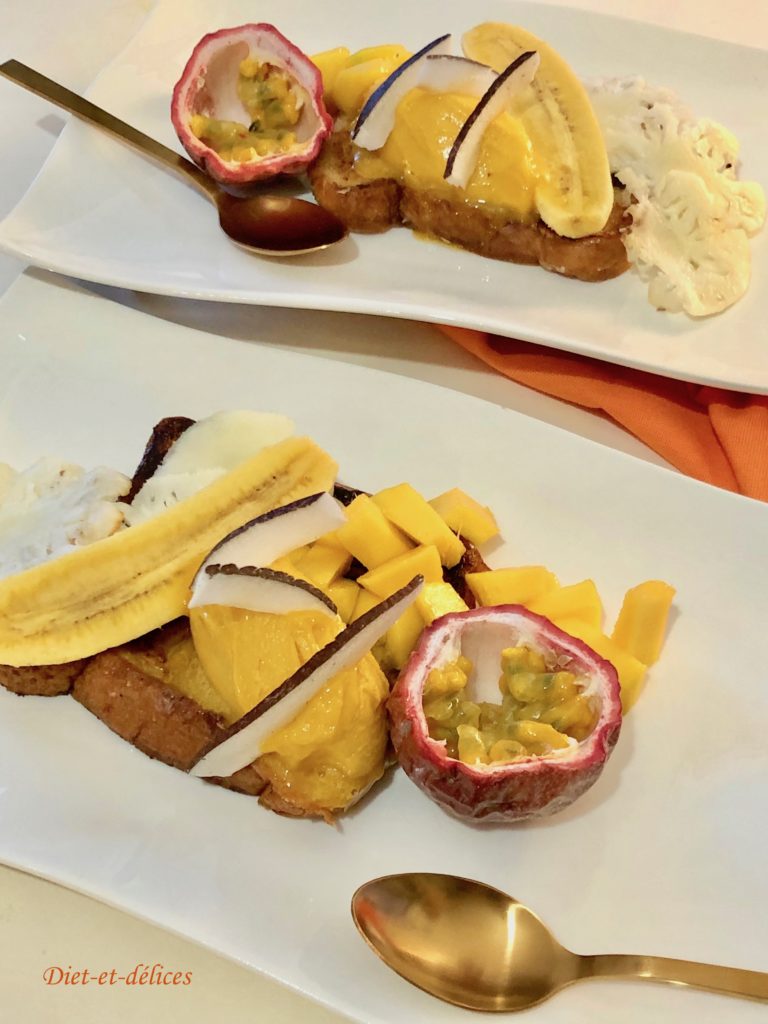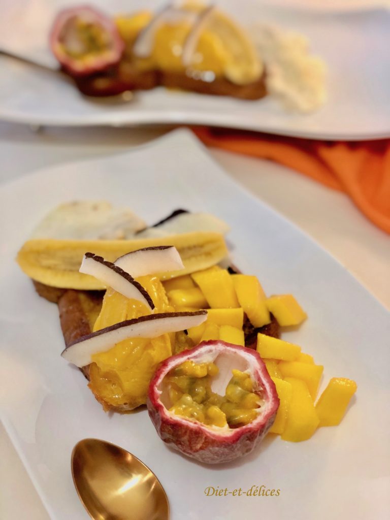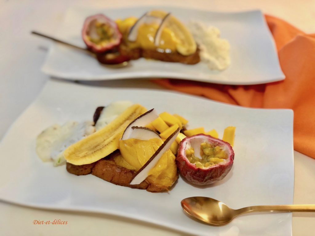 dessert, brioche, brioche perdue, fruits exotiques, glace, fruit de la passion, mangue , ananas, frécinette
