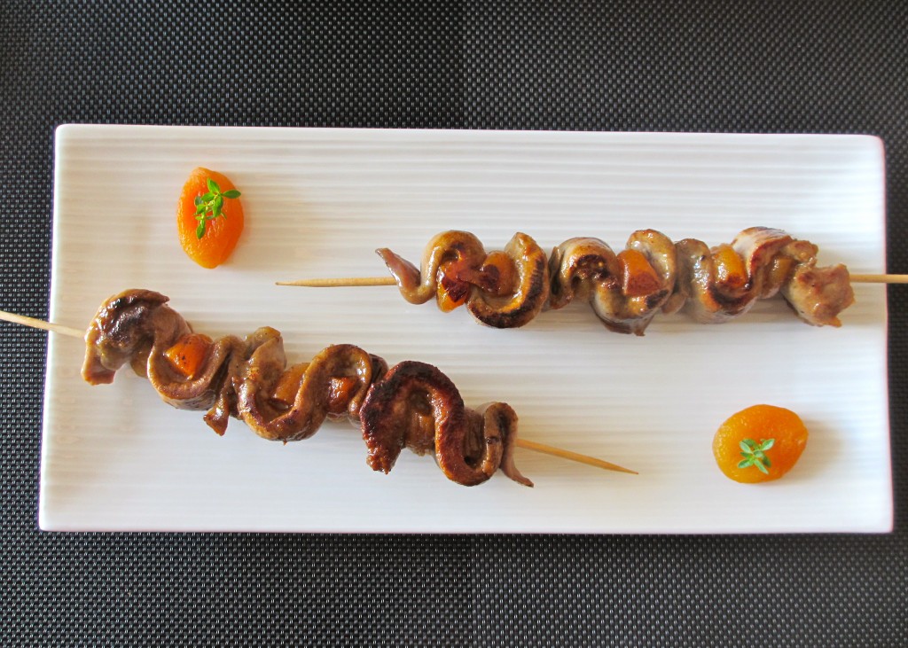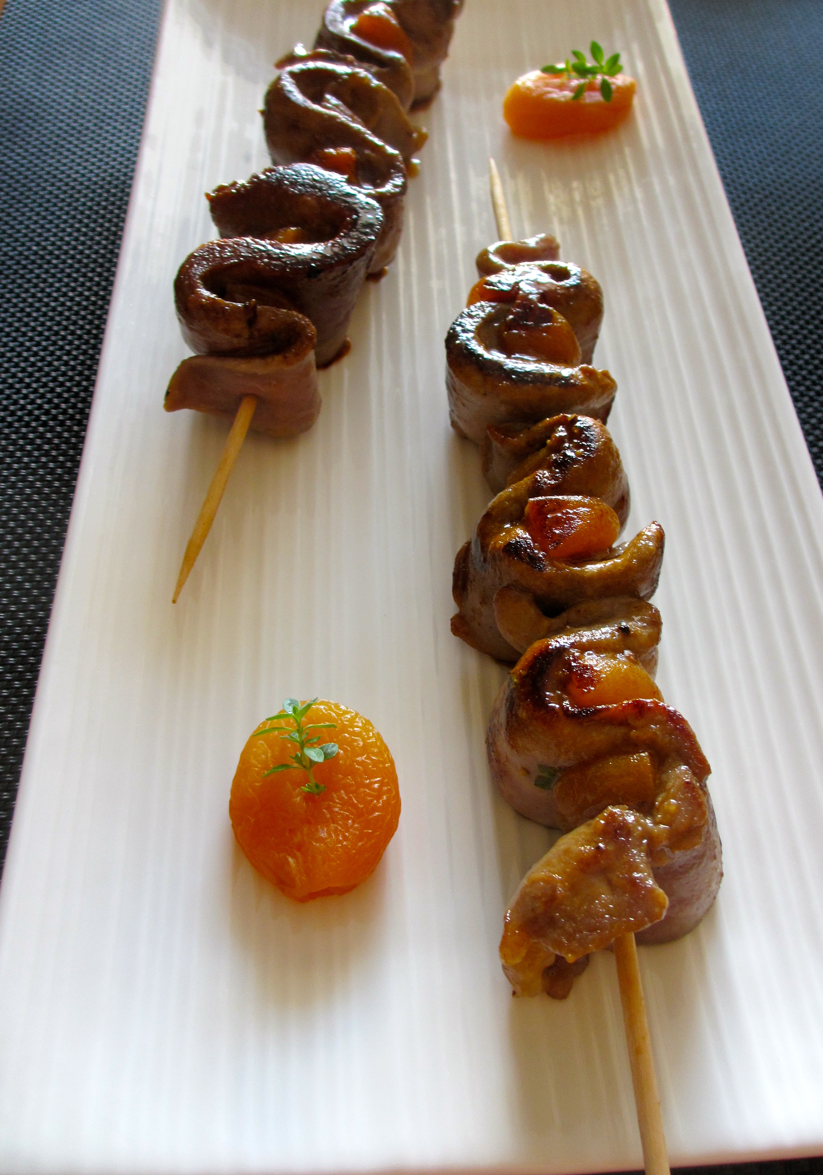 aiguillettes de canard,canard, brochettes, brochettes de canard, abricots,abricots secs, sucré salé, miel, thym citronné, vinaigre d’abricots, marinade, viande