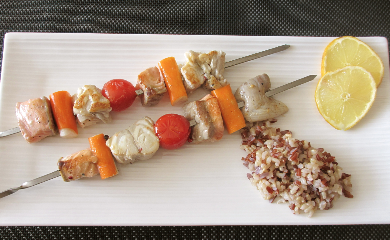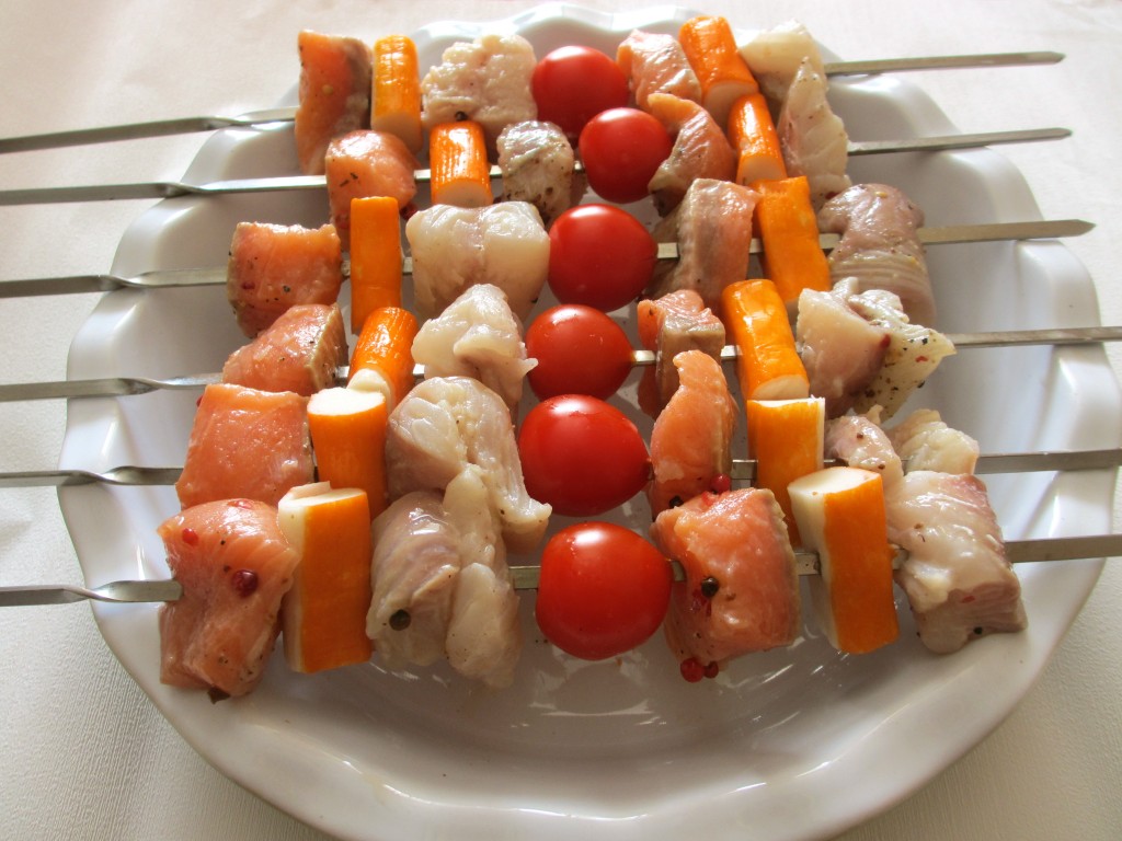 brochette, saumon, lieu noir, brochette de poisson, surimi,marinade, brochette de saumon, vinaigre de noix de coco, marinade pour poisson