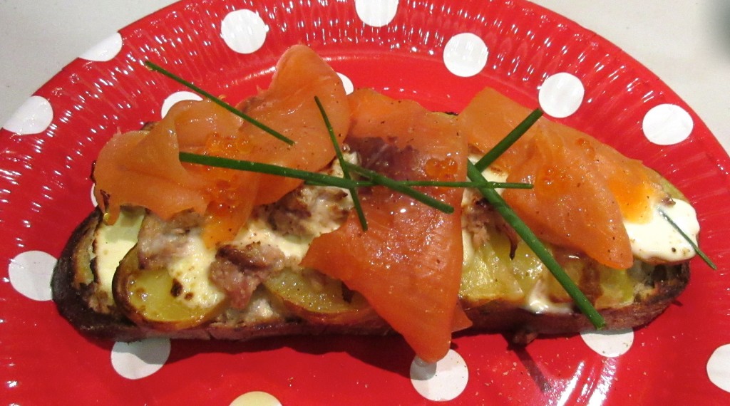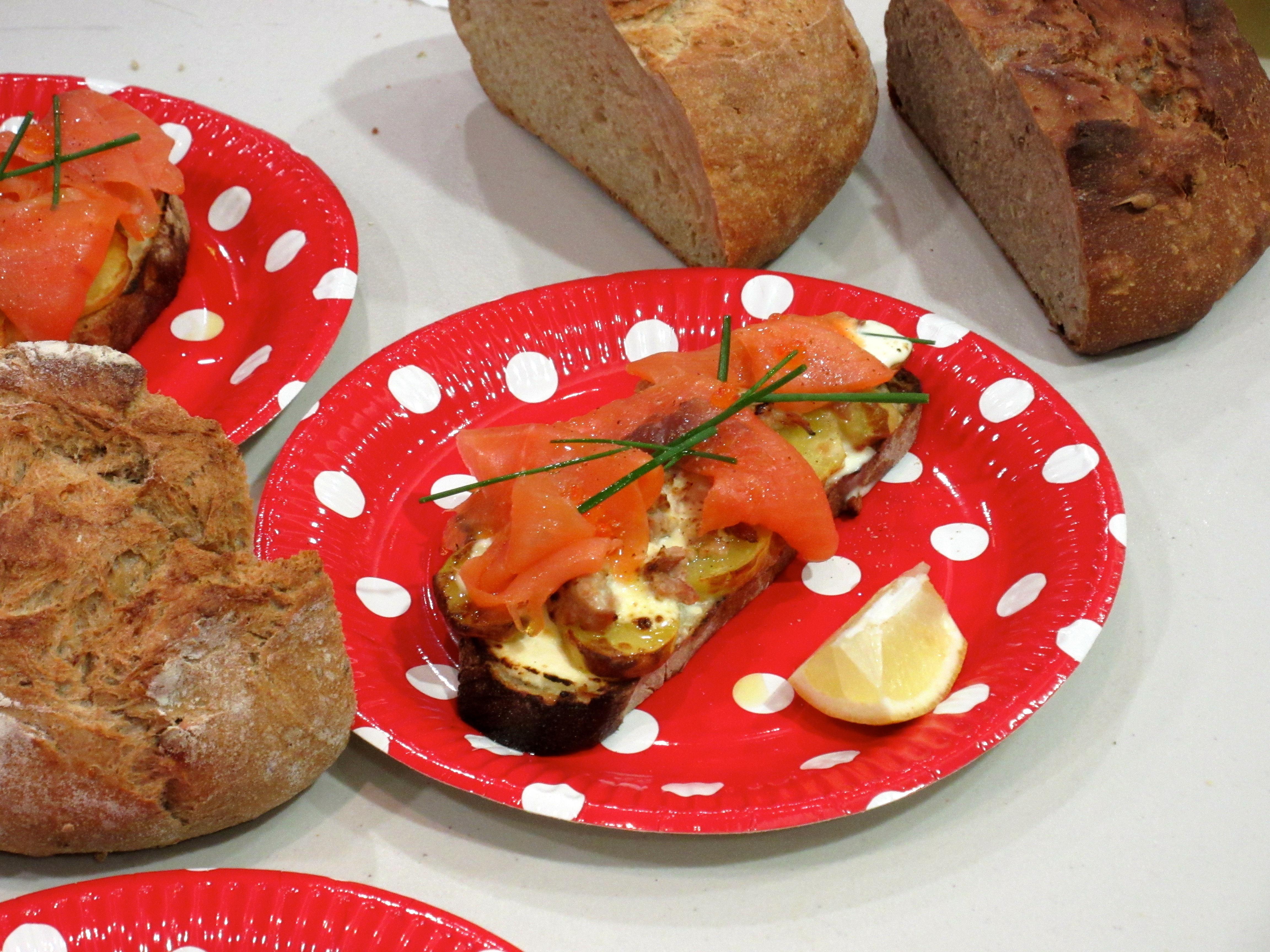 bruschetta, bruschetta au poisson, poisson, truite fumée, oeufs de truite, fromage frais, philadelphia, pommes de terre, thon, thon au naturel,ciboulette, crème fraîche, tartine, tartine chaude