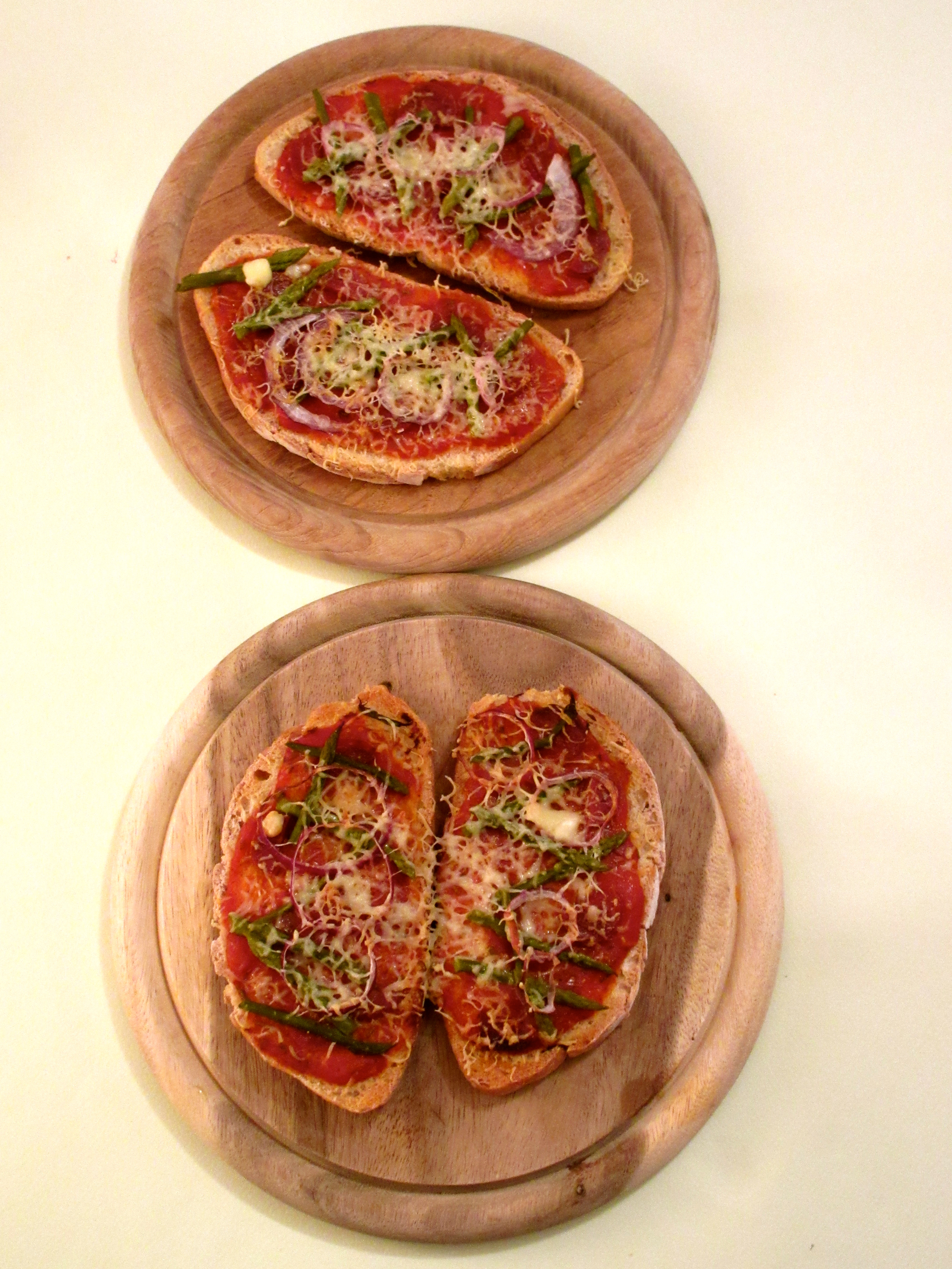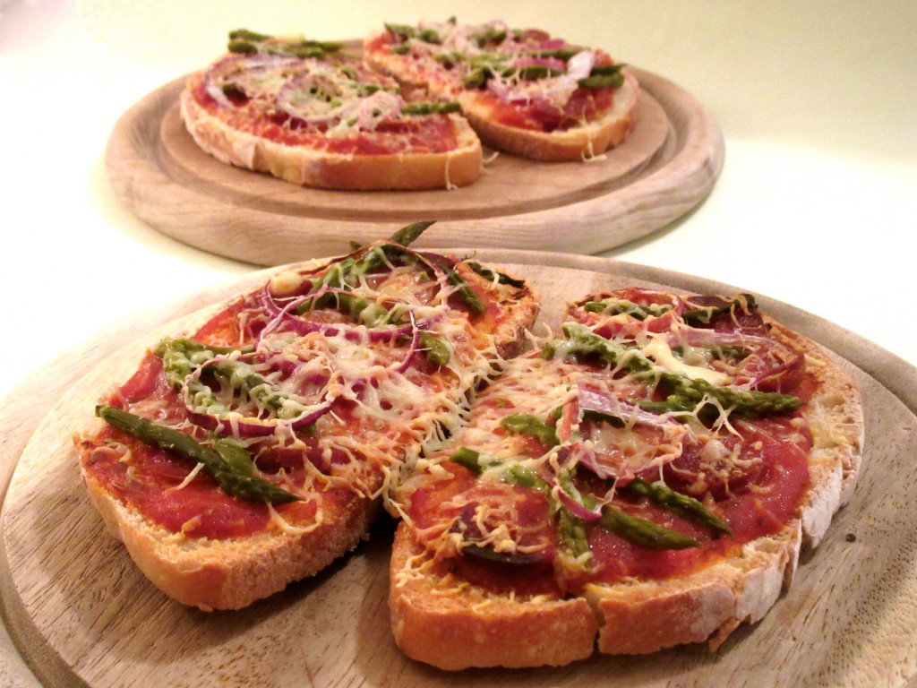 bruschetta, bruschetta aux asperges, bruschetta au chorizo, tartine, tartine chaude,pointes d’asperges, asperges, chorizo,sauce tomate, bruschetta gratinée,gruyère, tartine gratinée, recette rapide, rapide,cuisine facile, cuisine simple, brunch