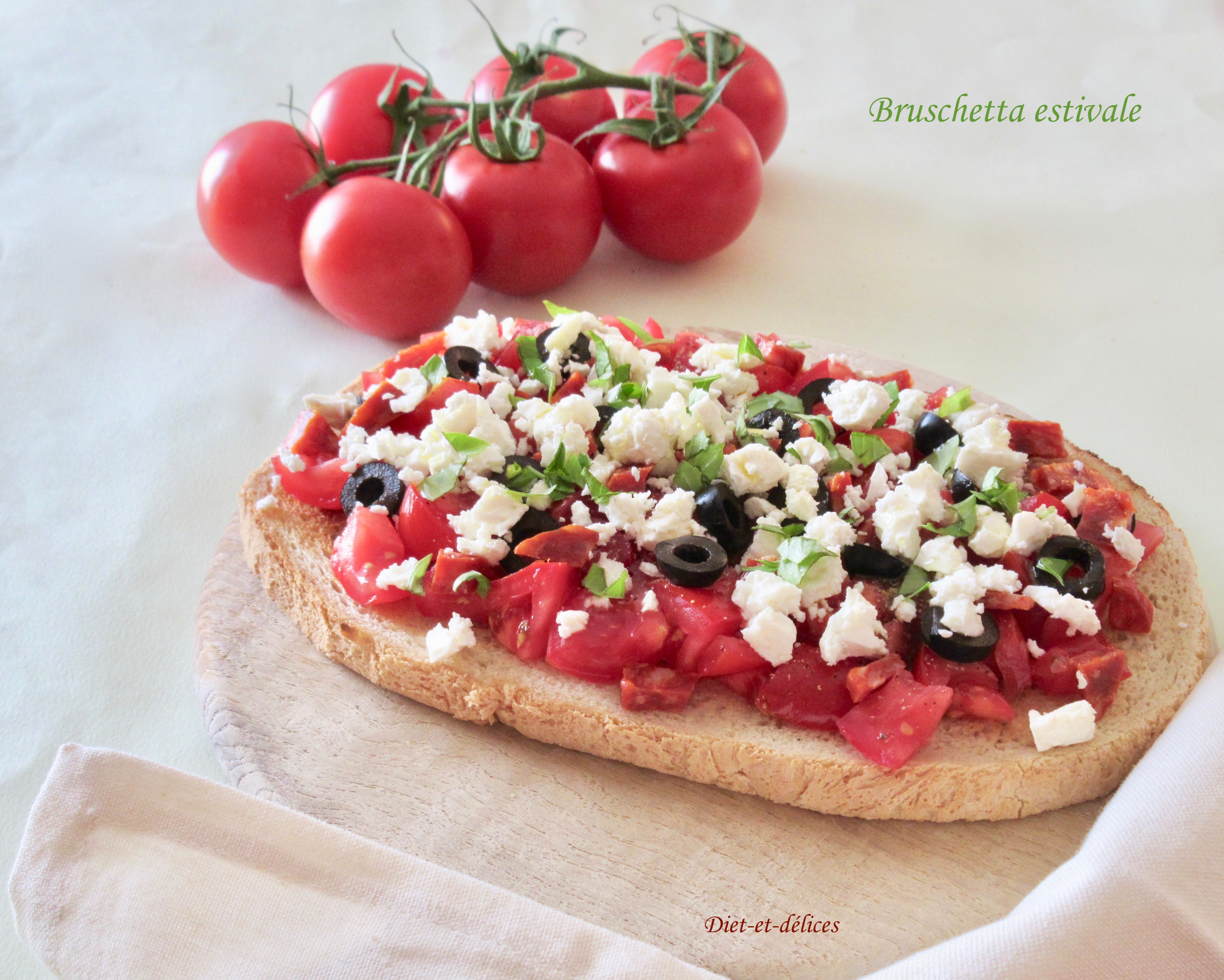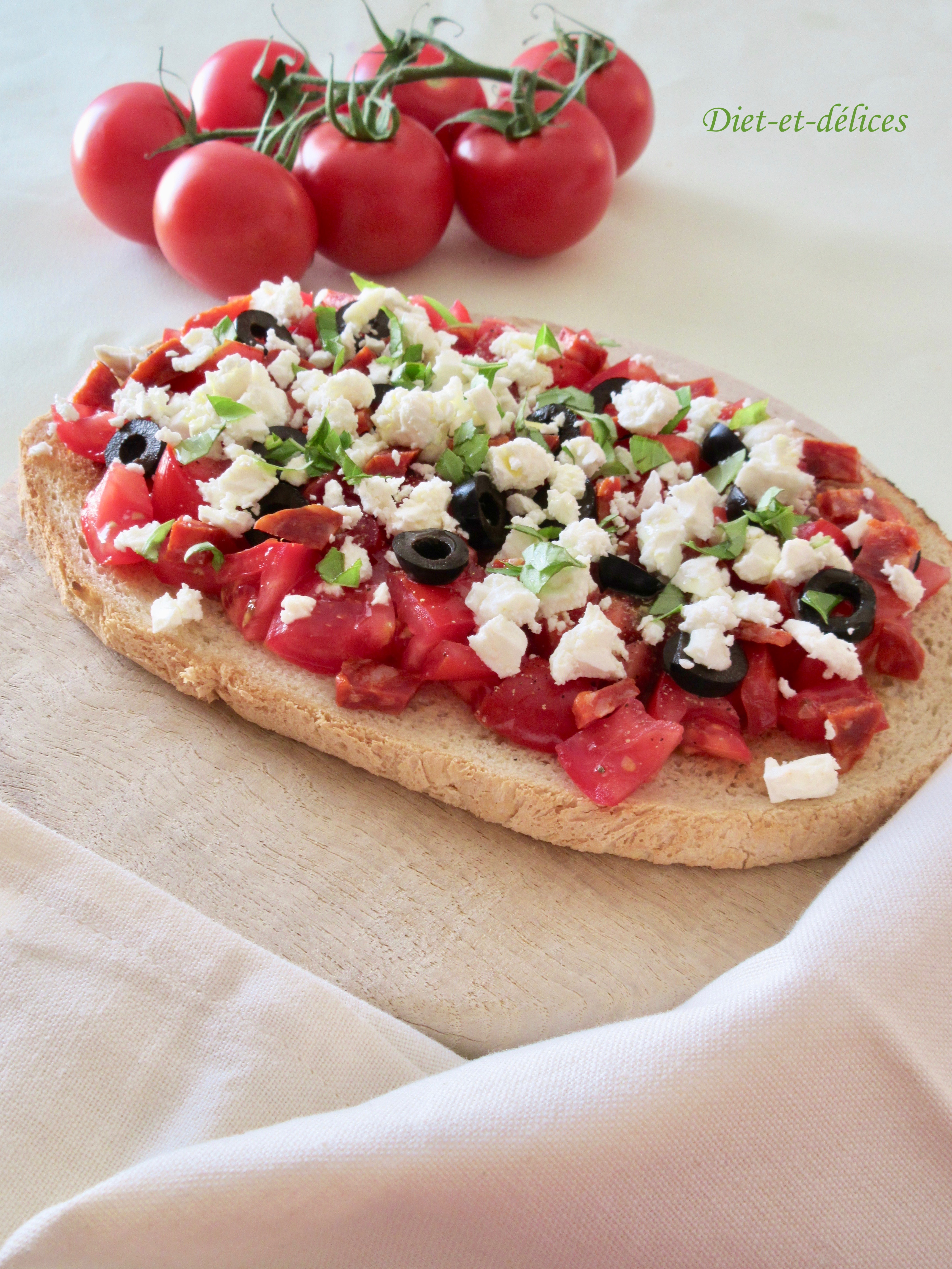 bruschetta, apéro, apéritif, tomate, chorizo, feta, olives, basilic, cuisine d’été