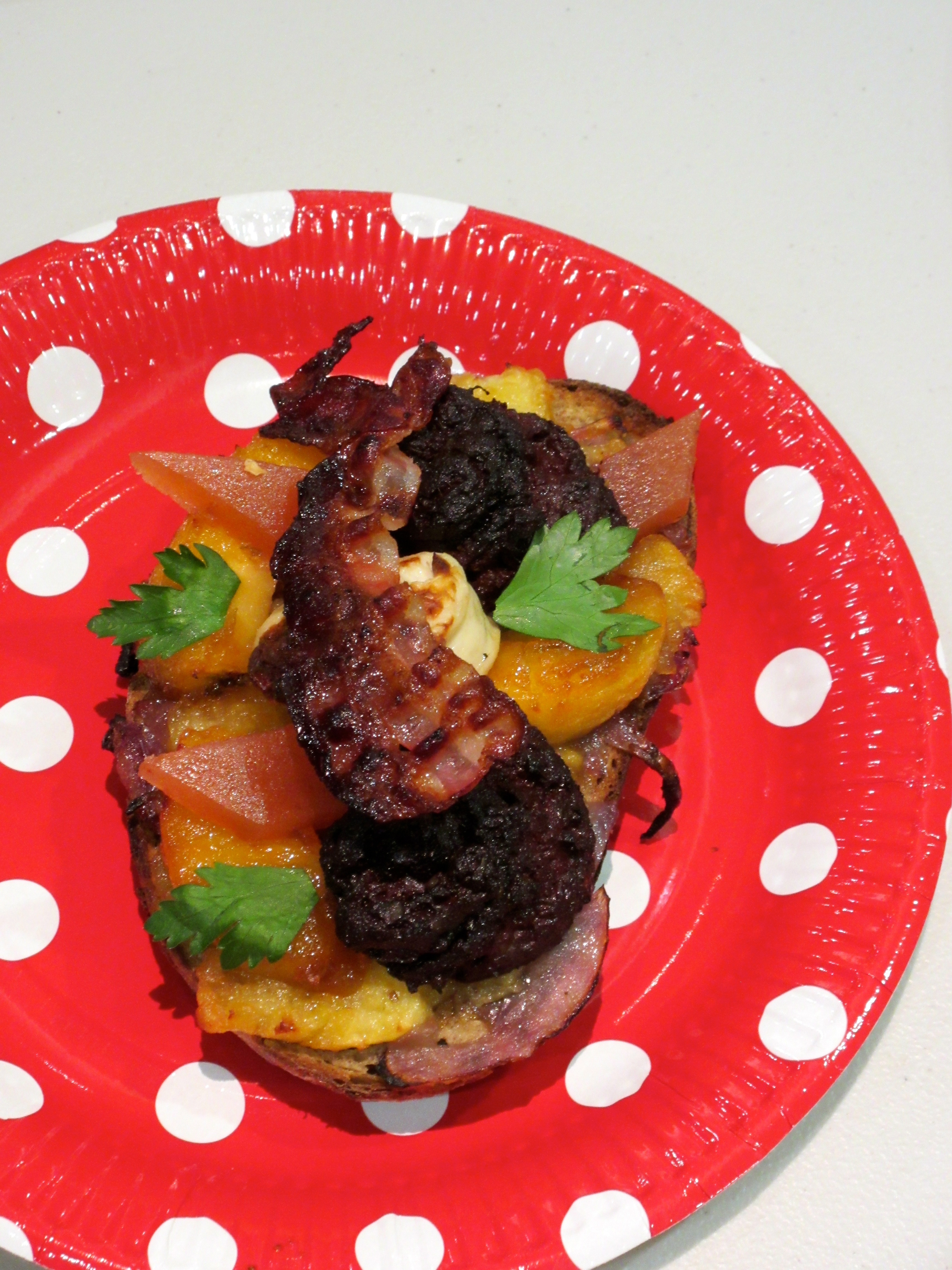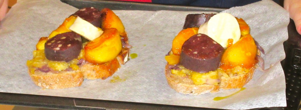 bruschetta, bruschetta au boudin, boudin noir, boudin blanc, boudin aux pommes, pommes, caramel, sucré salé,lard, oignon, tombée d’oignons, persil plat