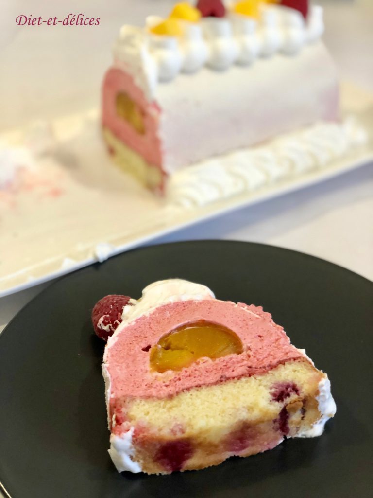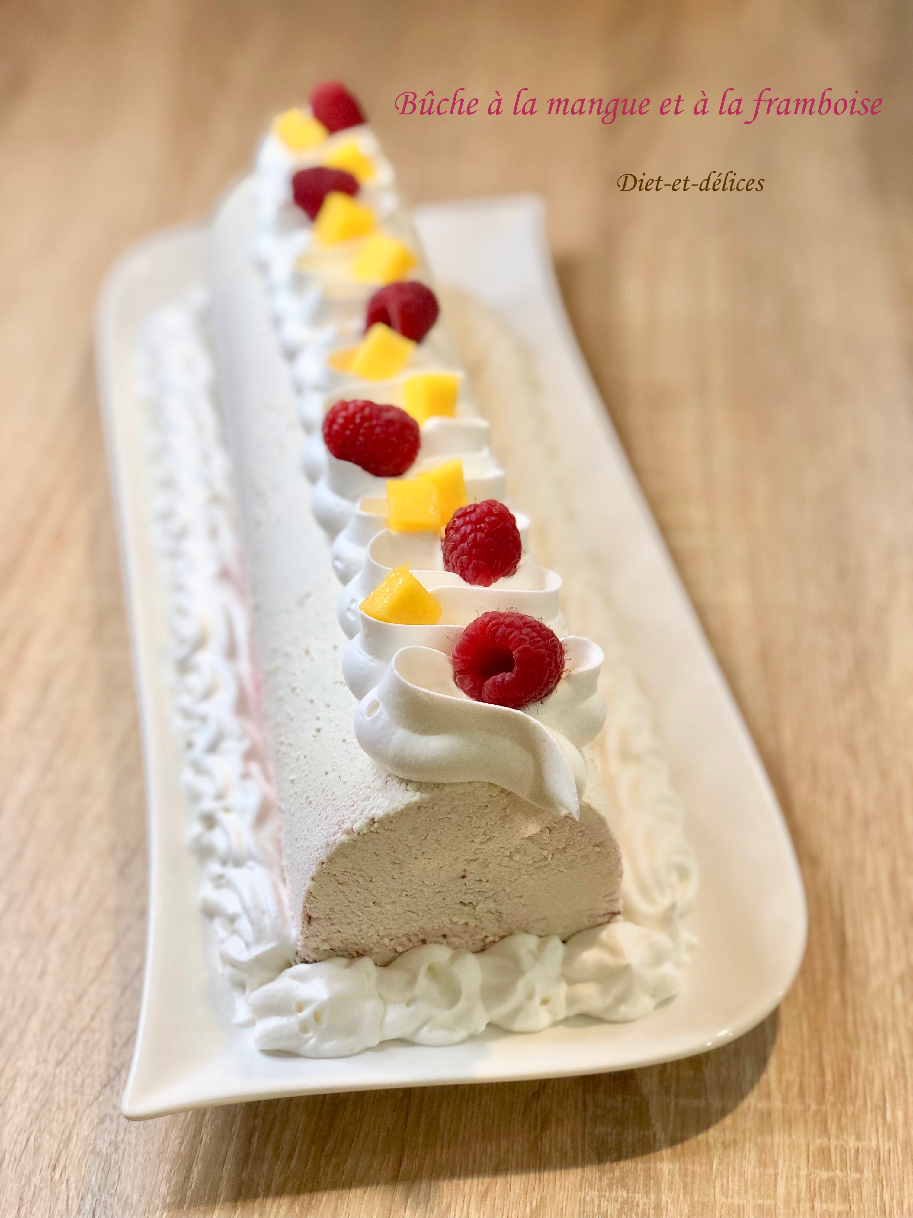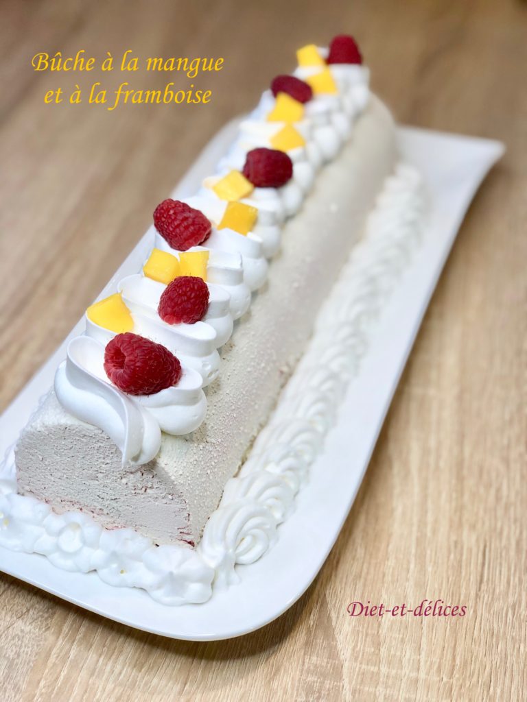 bûche , bûche de noël, mangue, bûche mangue framboise, framboise, dessert, biscuit madeleine, mousse aux framboises