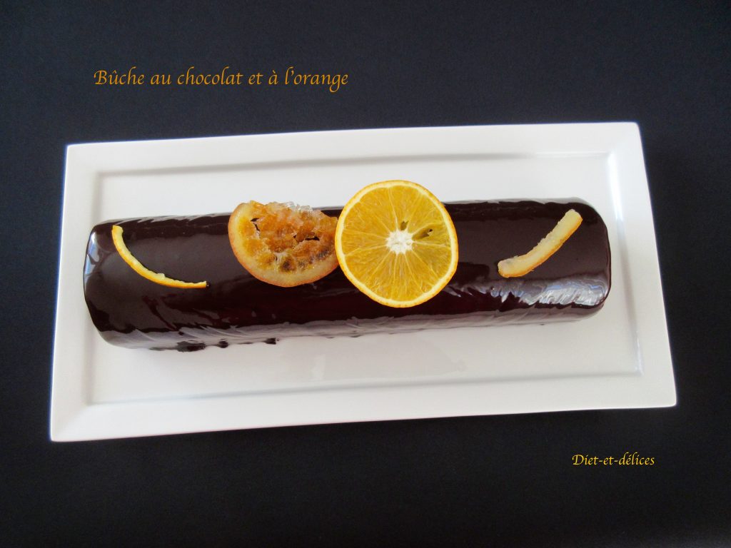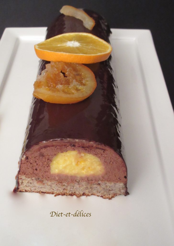 bûche, orange, biscuit joconde, bûche au chocolat, crémeux orange, poudre de noisettes, bûche au chocolat et à l’orange, orange confite, fruit confit, glaçage miroir, mousse au chocolat, Noël