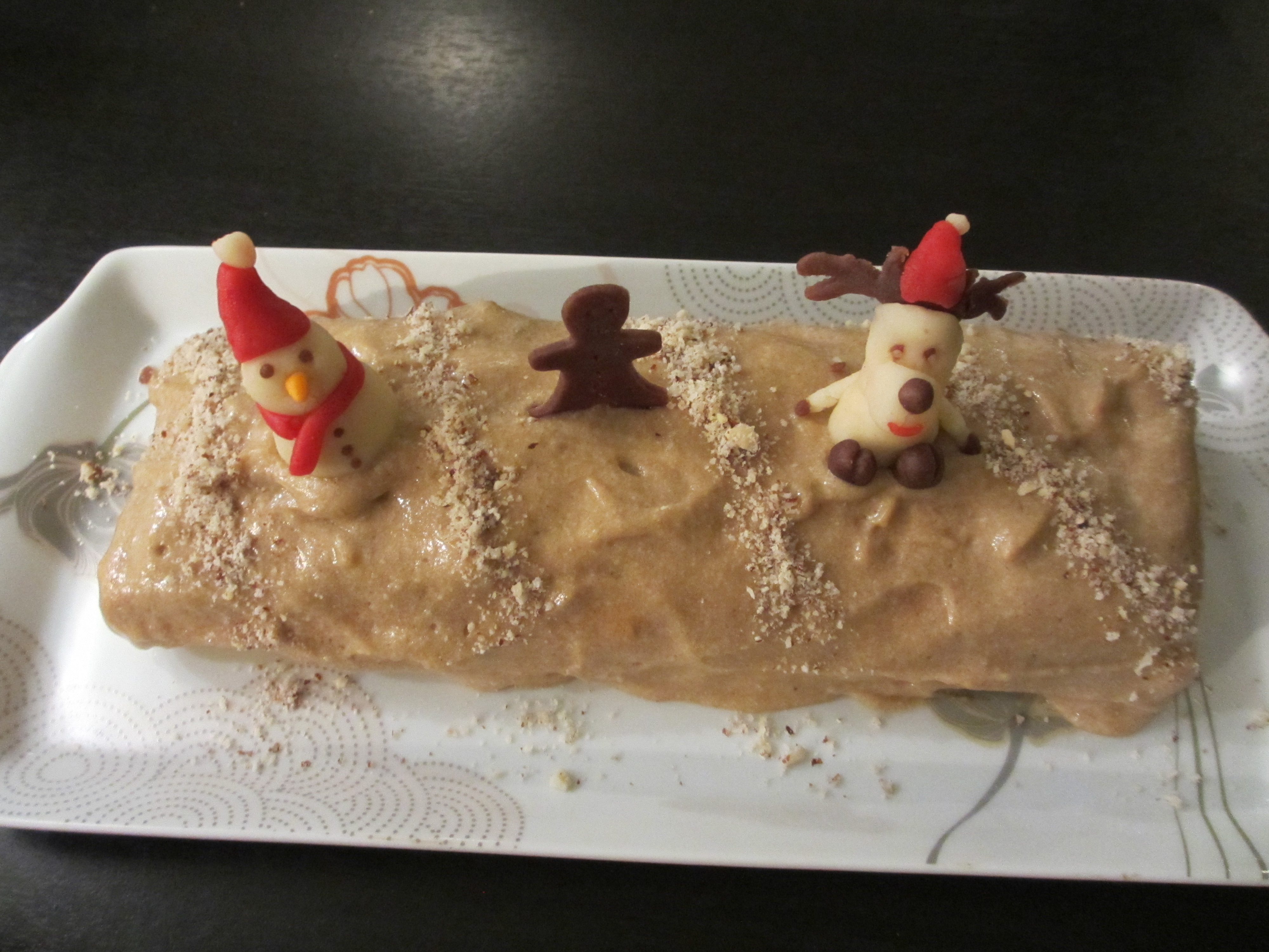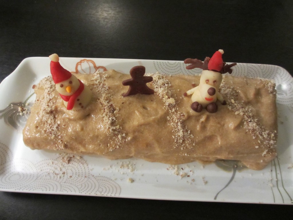 - Décorer la bûche avec des petits sujets en pâte d’amande et des noisettes concassées.