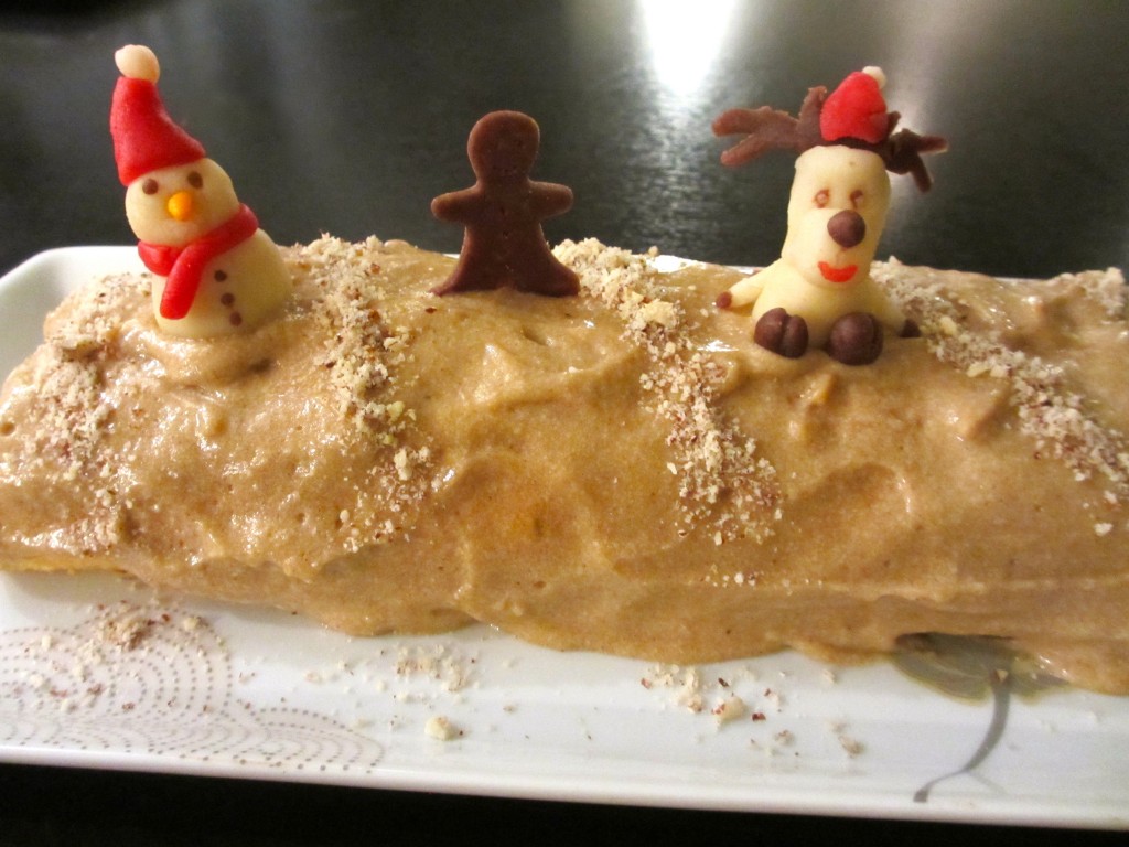 bûche, bûche de Noël, Noël, pralin, Noel, parliné bûche au praliné, dessert, dessert de Noël,fêtes, dessert de fête, génoise noisettes, amandes, décors pâte d’amande, pâte d’amande,décors, décors gâteaux