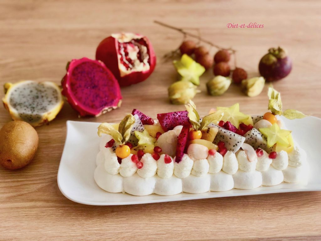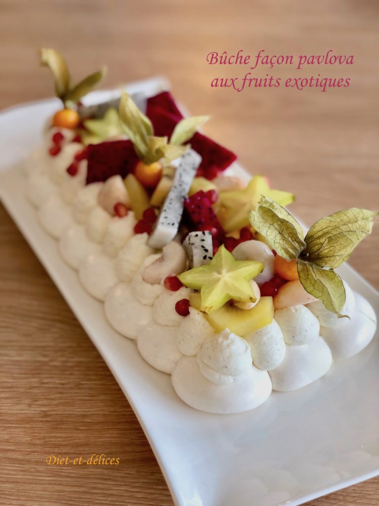 bûche, bûche de noël, pavlova, bûche aux fruits exotiques, fruits exotiques, dessert, meringue, chantilly, litchi, pitaya, carambole, physalis, mangoustan, grenade