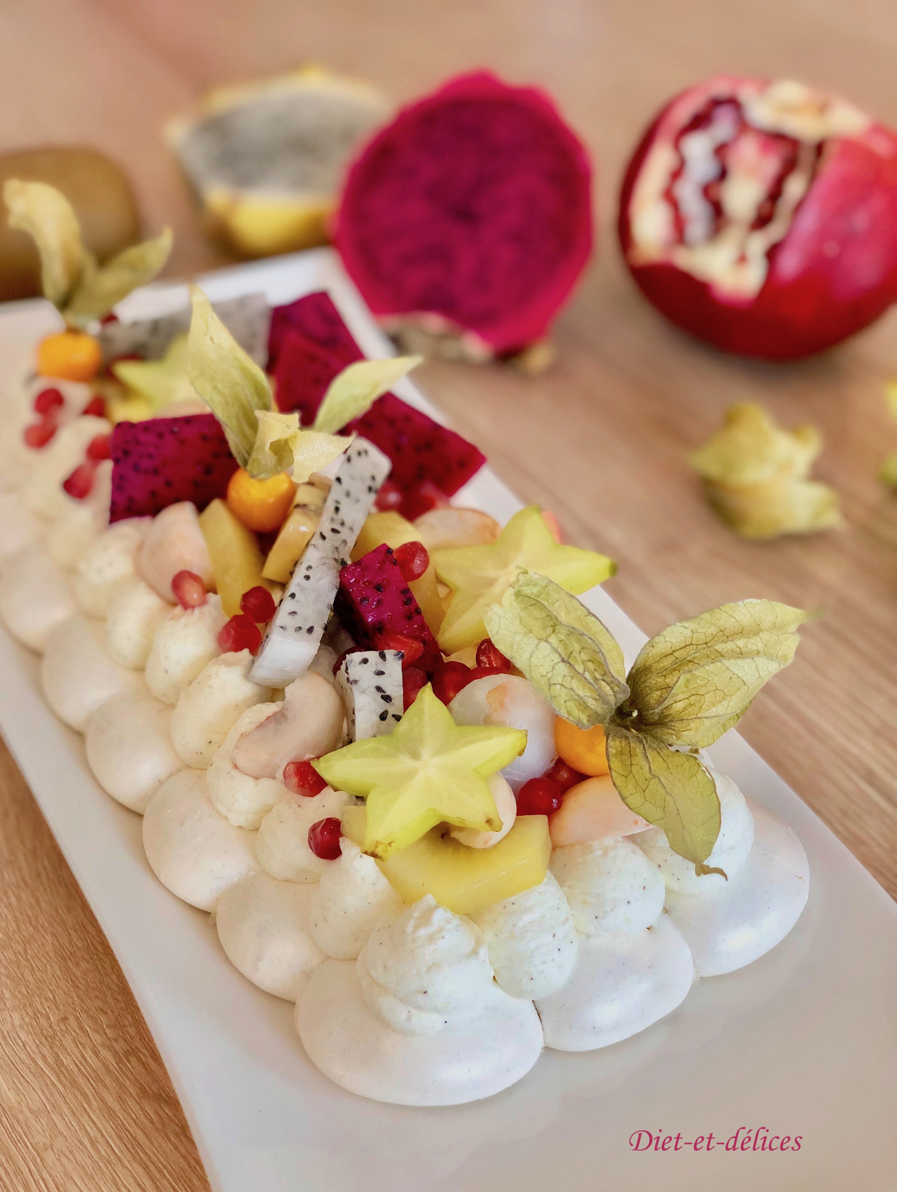 Une pavlova aux fruits exotiques, qui mettra du soleil dans vos desserts hivernaux ou vos desserts de Noël.
