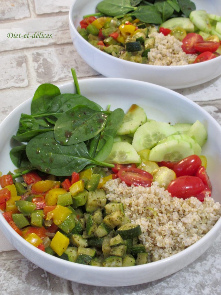 buddah bowl, quinoa, épinardsbuddah bowl au quinoa, concombre, poivroncourgette, tomates cerises, citron vert