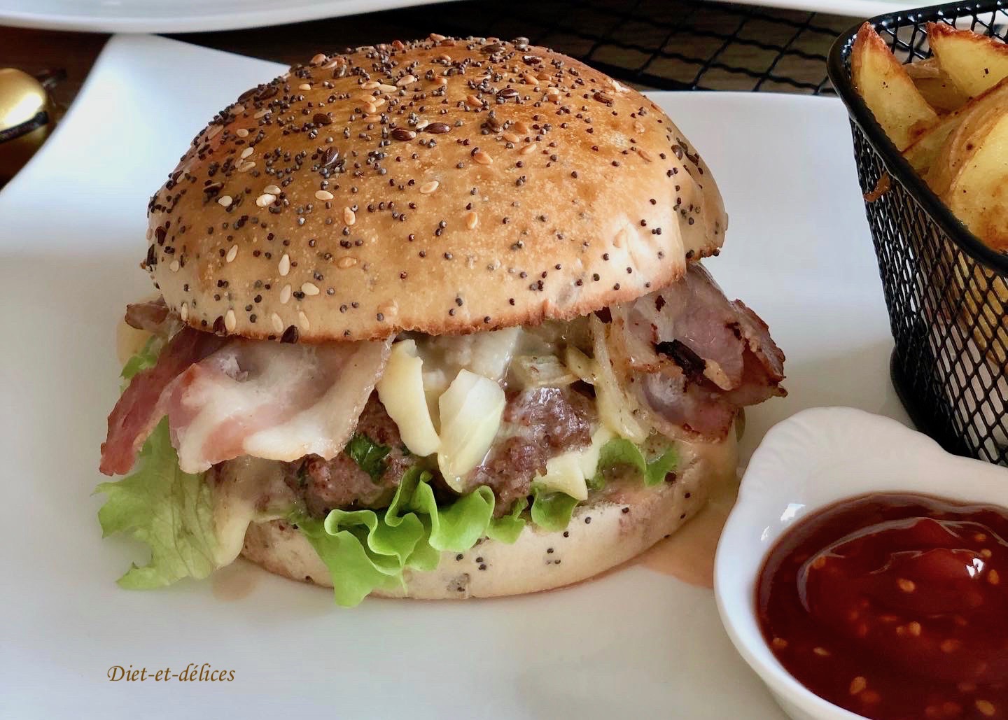 burger, hamburger, lard, reblochon, sauce worcestershire , ketchup, viande hachée, sauce sucrée salée