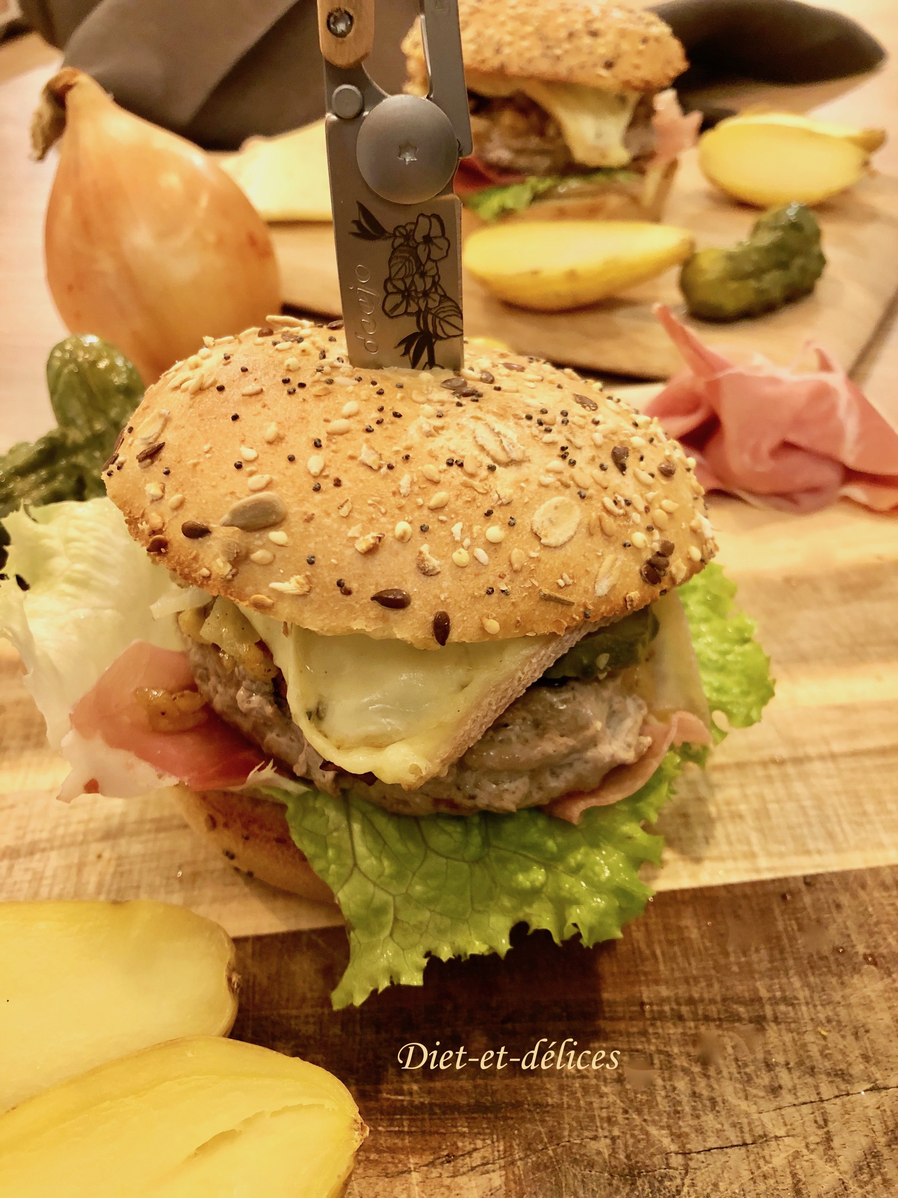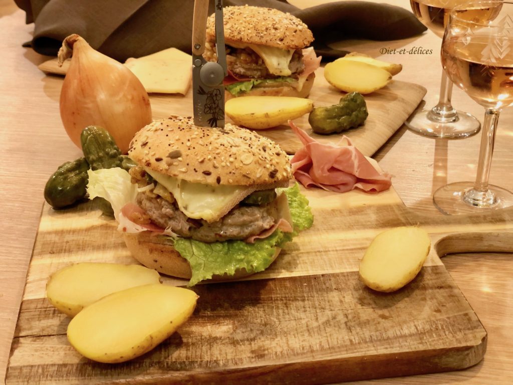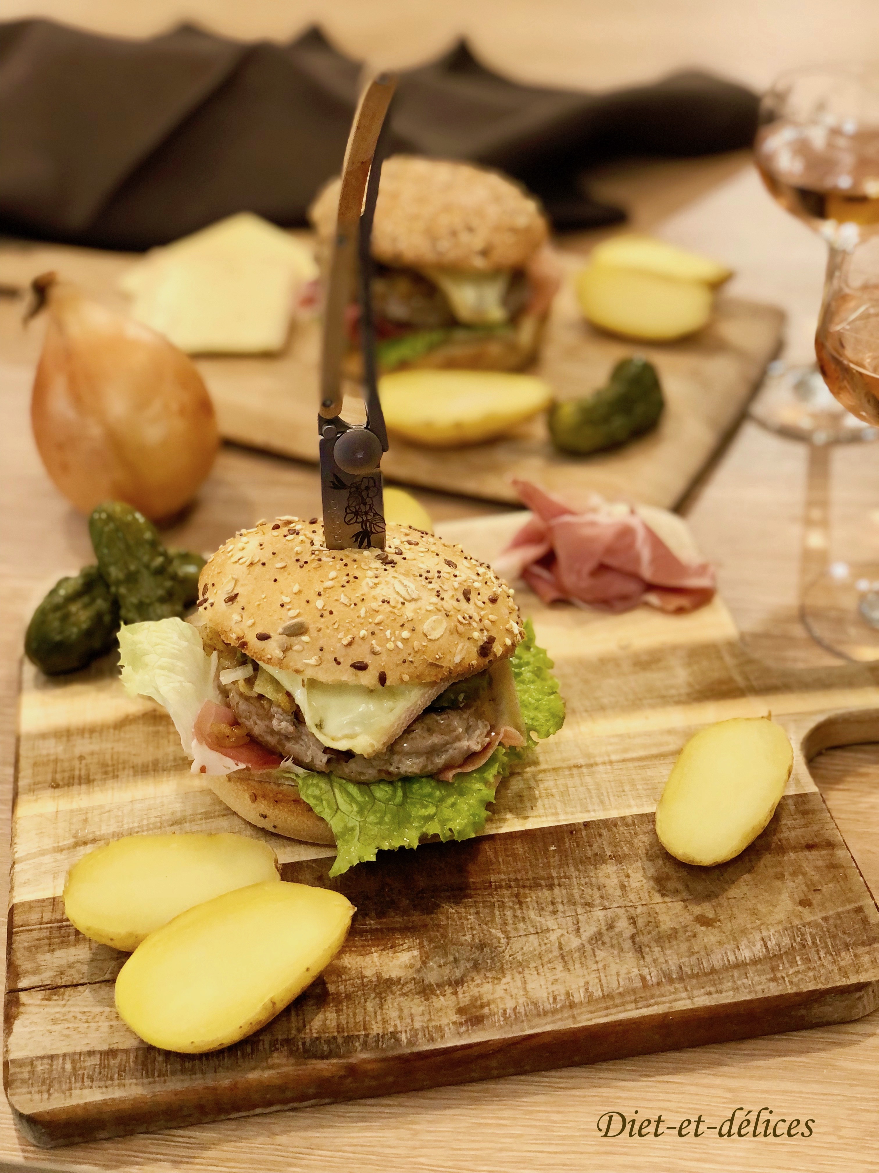 burger, hamburger, raclette, burger raclette, veau, fromage à raclette, cornichon, jambon cru, steak de veau
