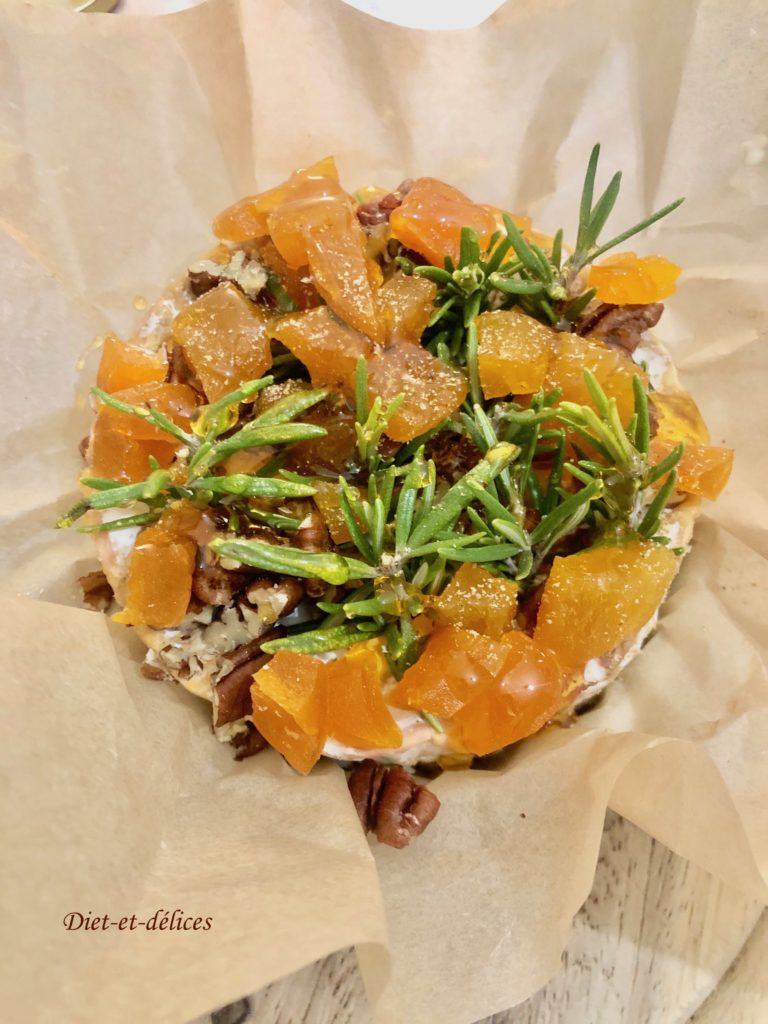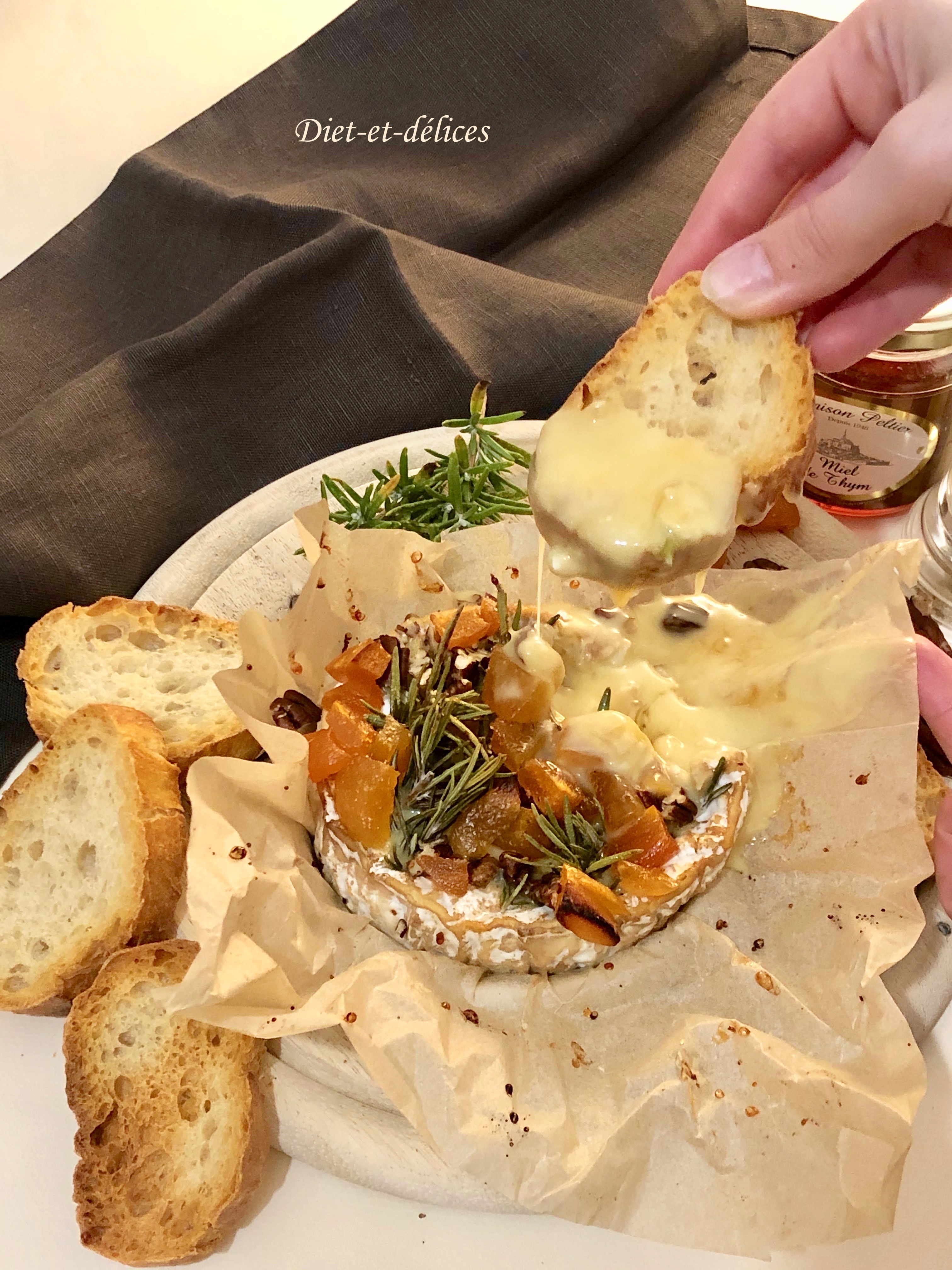 camembert, camembert rôti, abricots secs, noix de pécan, romarin, apéro