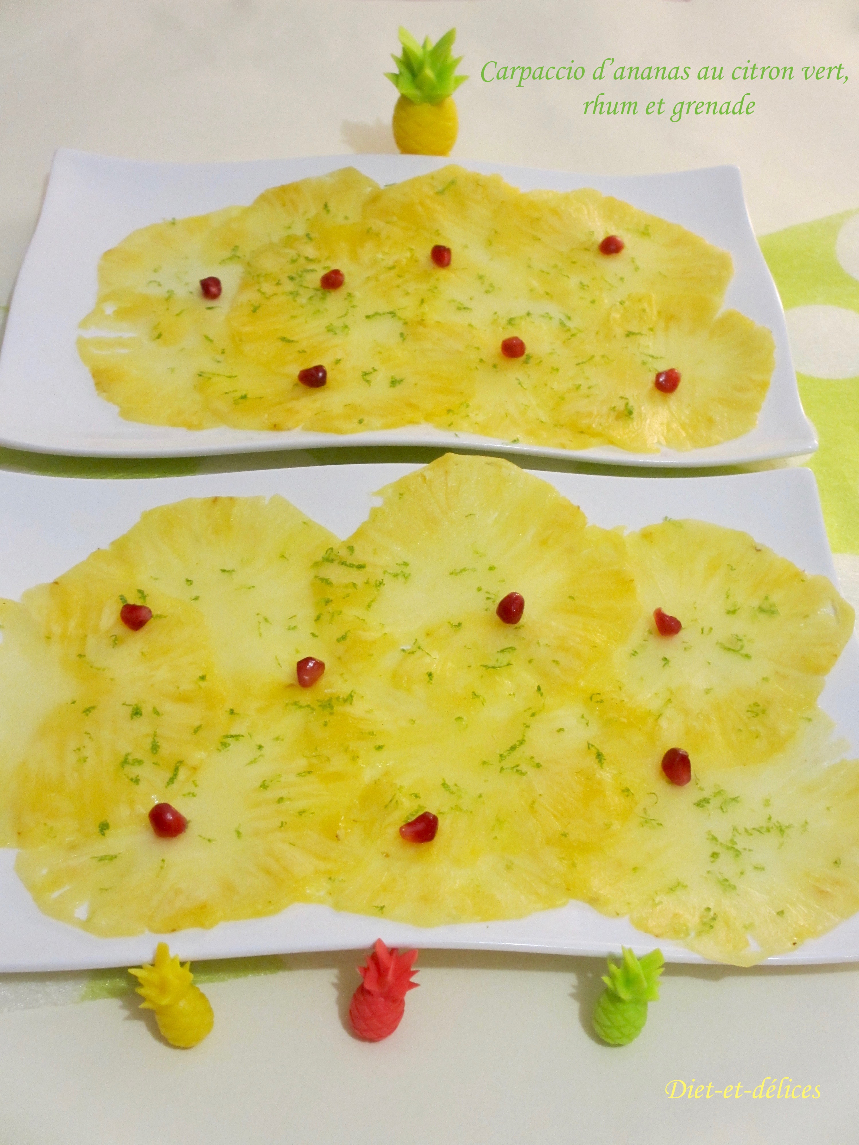 dessert, ananas, carpacciocitron vert, rhum, carpaccio d’ananasgrenade, végétarien, diététique