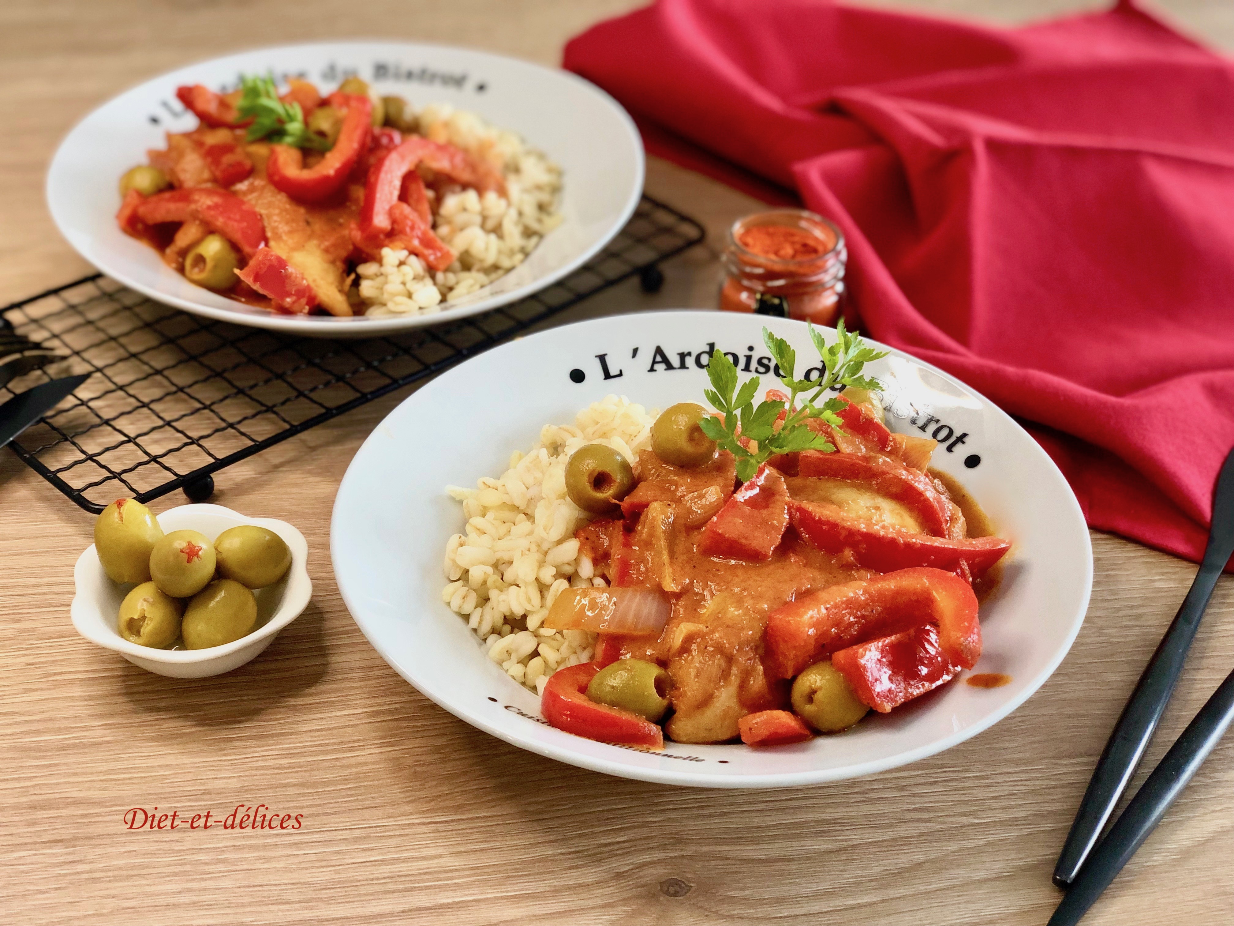 Filets de poulet, sauce aux poivrons et olives