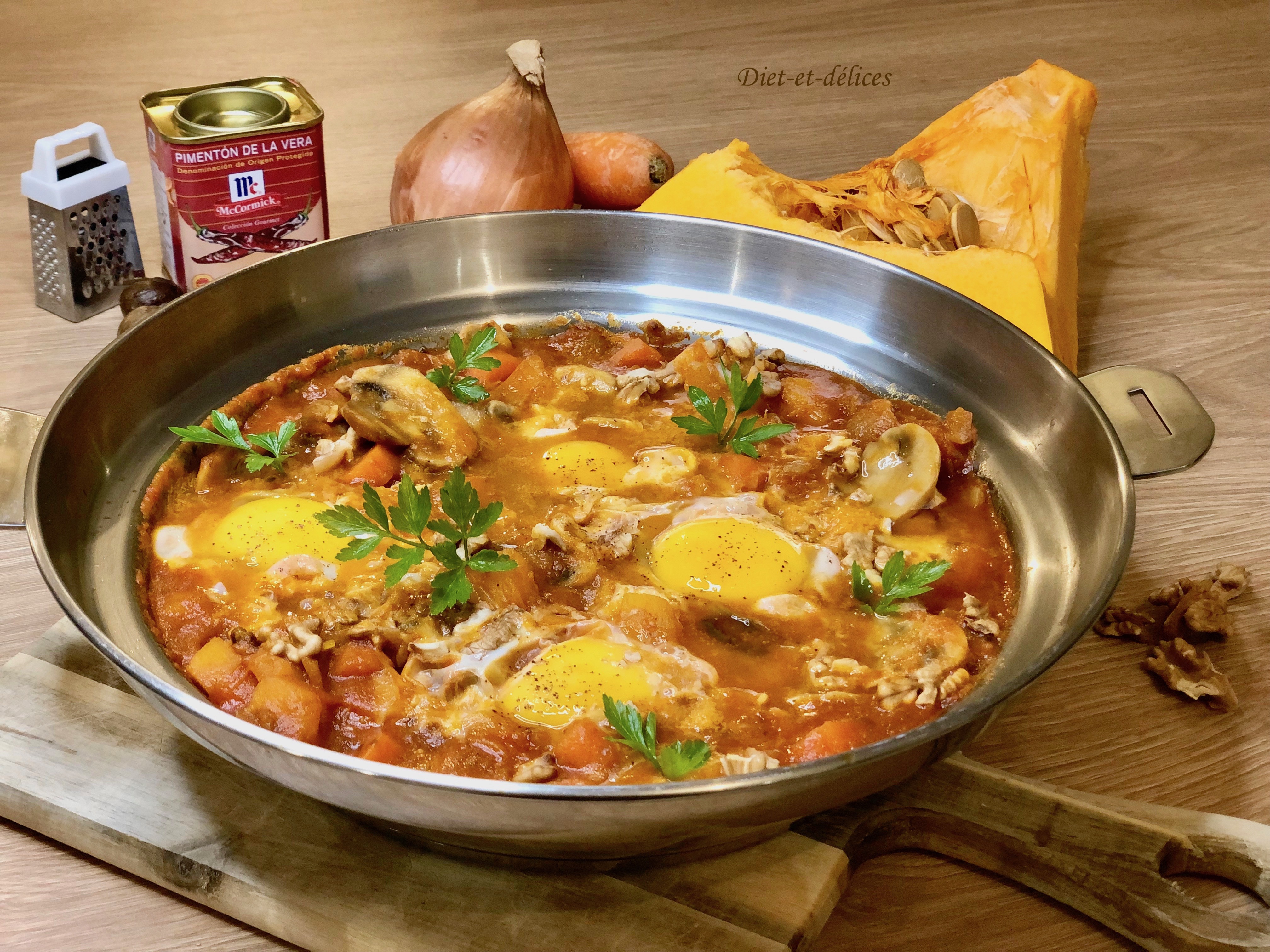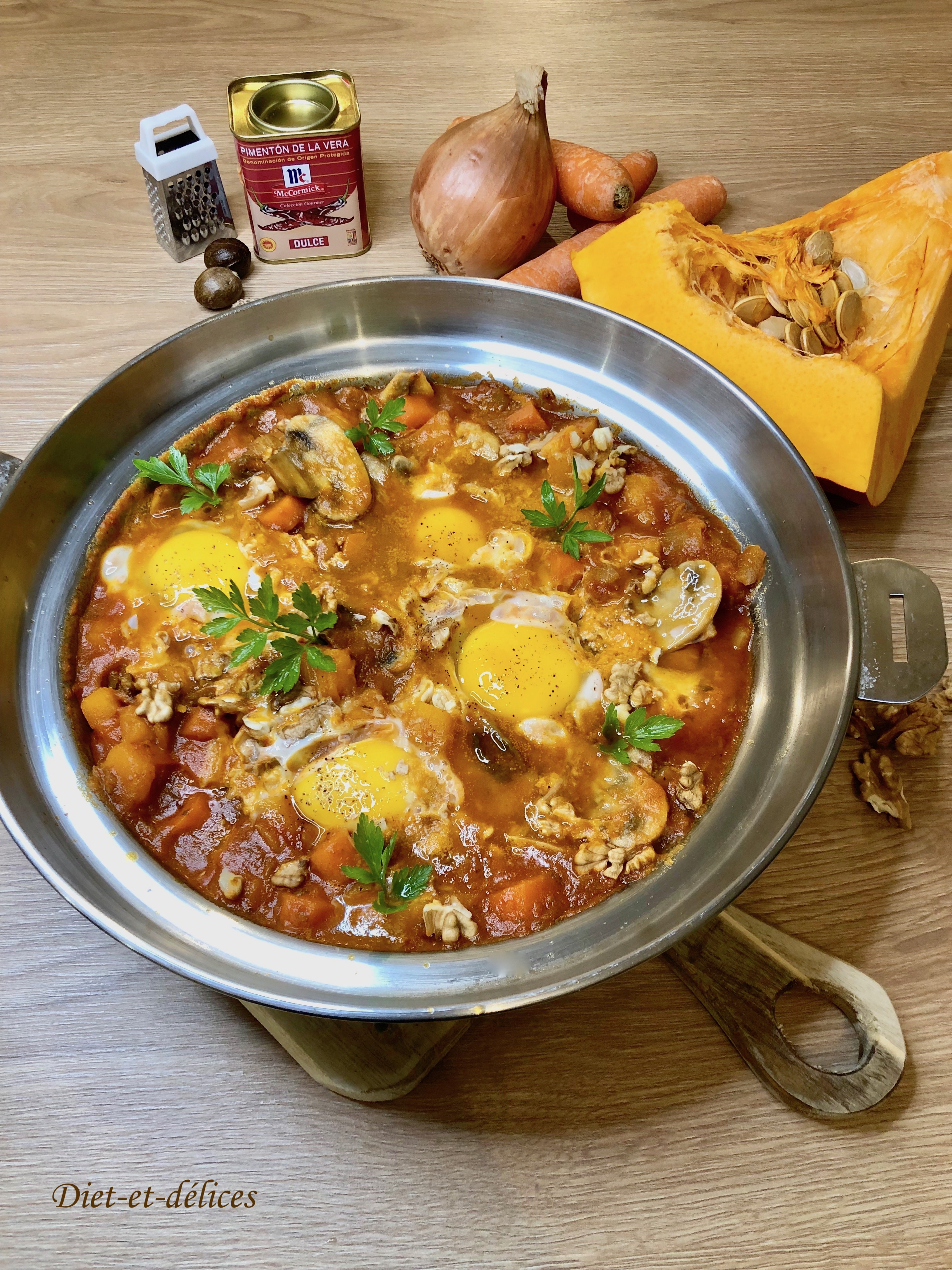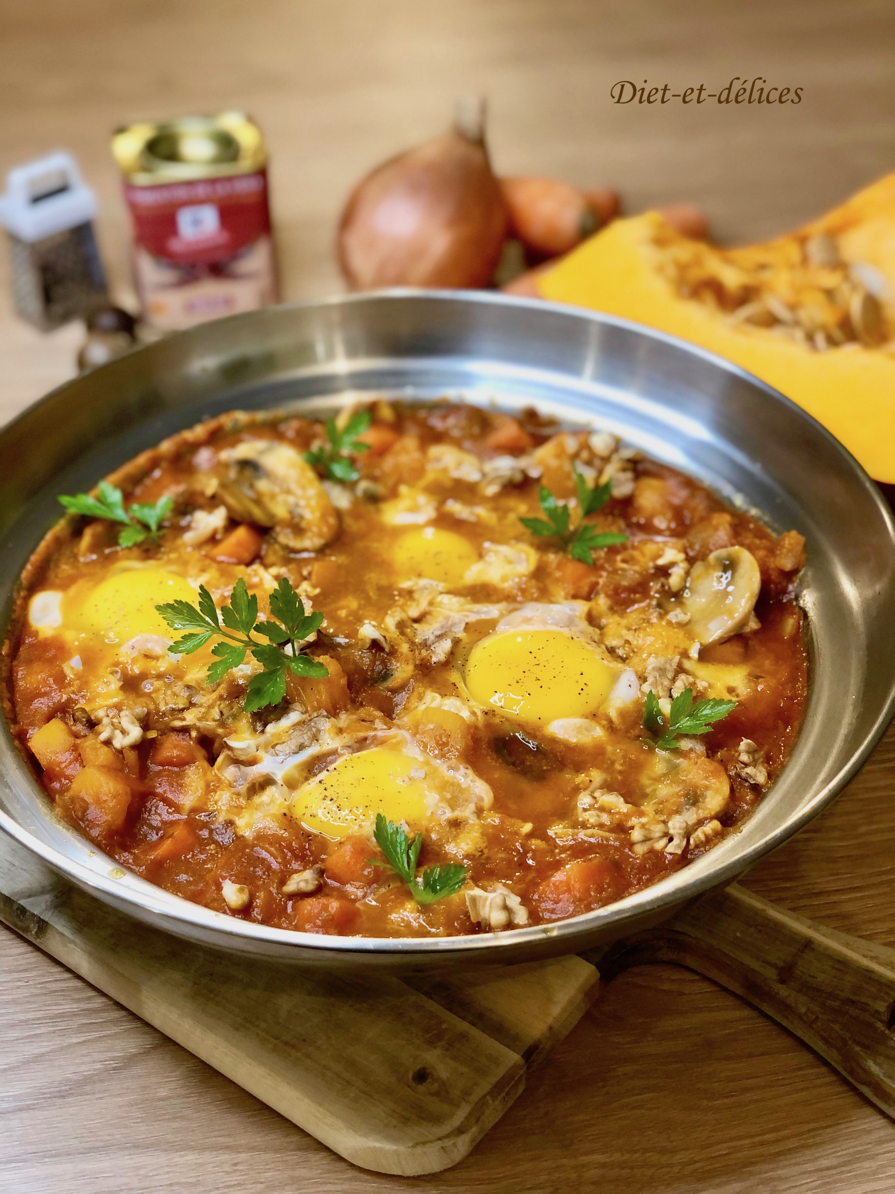 chakchouka, potiron, champignons, oeuf, noix, carottes, plat complet, végétarien, cuisine saine