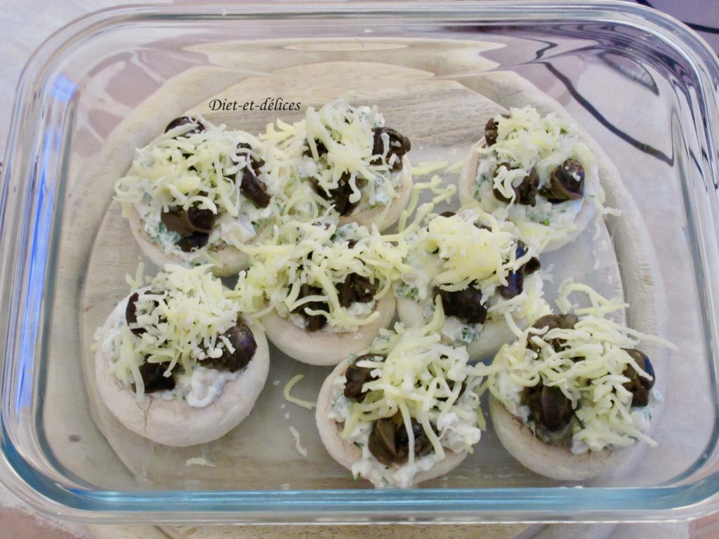 - Beurrer un plat à gratin et y déposer les champignons. Les garnir généreusement de la préparation au fromage blanc.