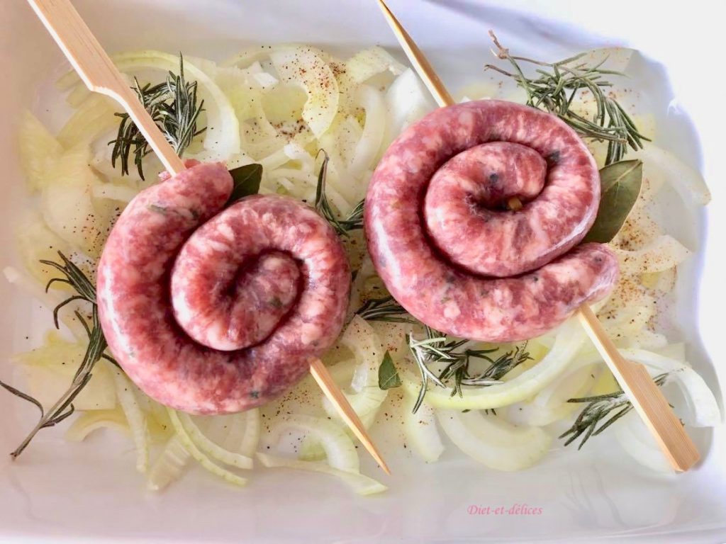 Star des barbecues, la chipolata se cuisine sur les braises, à la poêle ou au four. Roulée de cette façon, elle fait une jolie présentation sur l’assiette.
