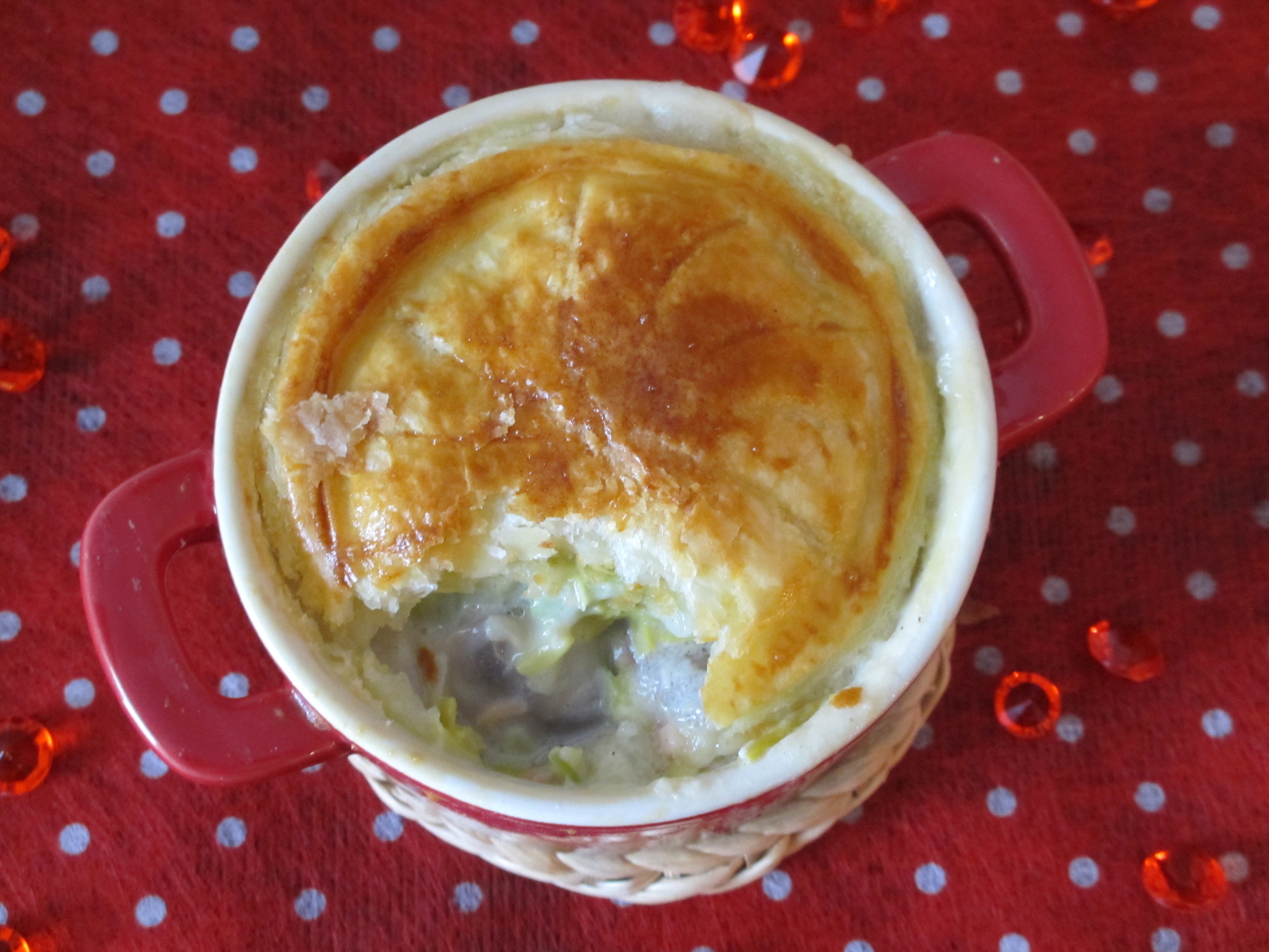 cocotte de saumon,cocotte au poisson, croûte de pâte feuilletée,saumon en croûte, saumon, cocotte, saumon fumé, champignons, poireaux, pâte feuilletée