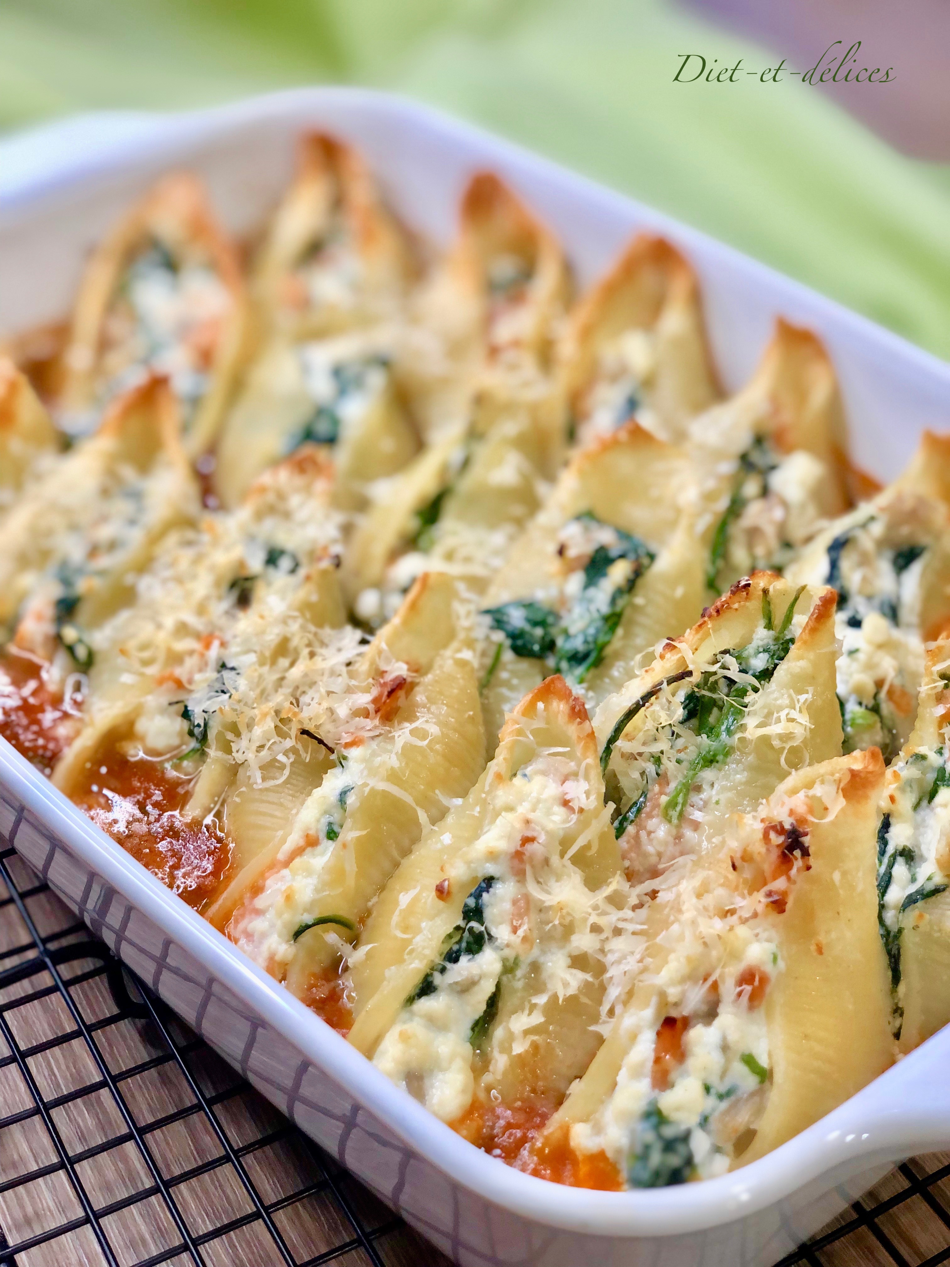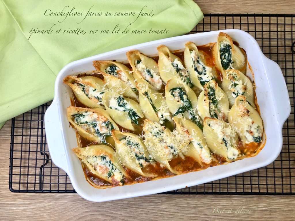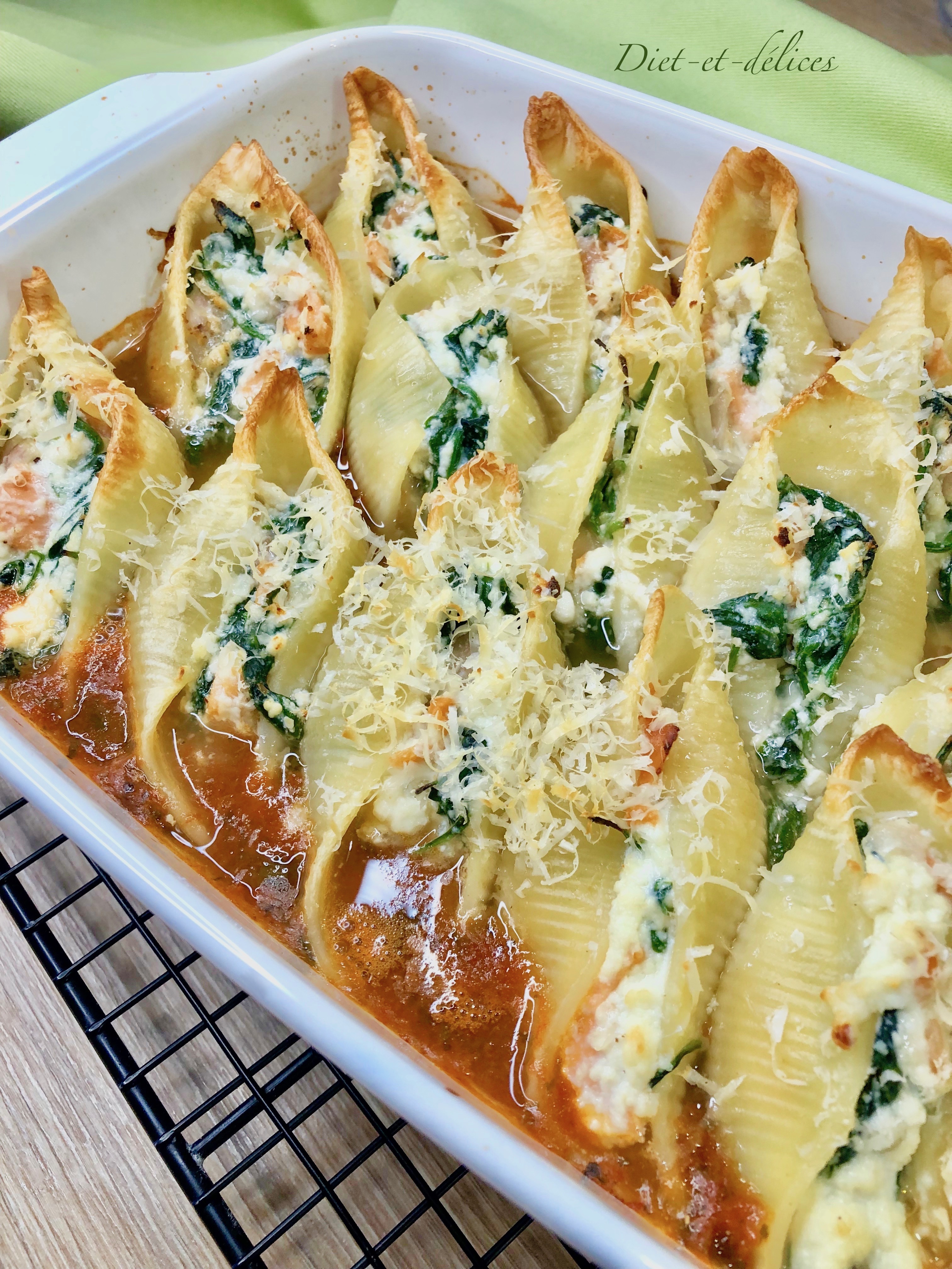 conchiglioni, pâtes, saumon fumé, sauce tomate, épinards, ricotta