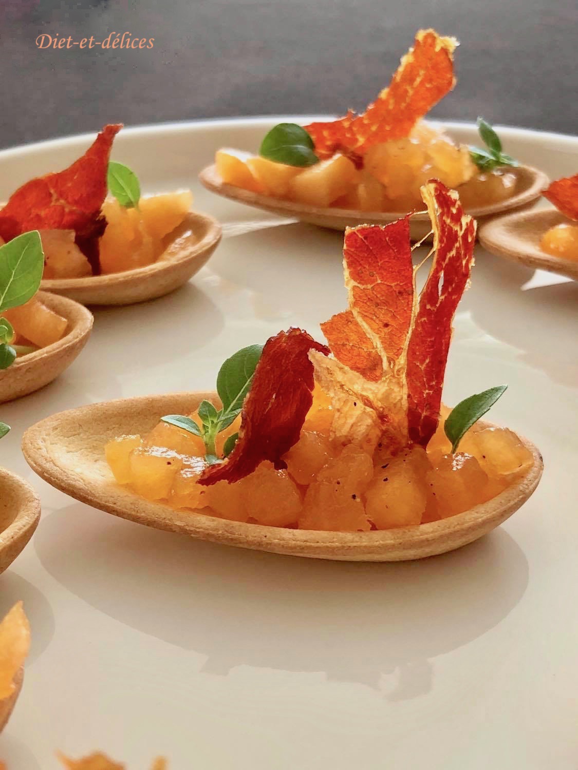 - Casser la chips de jambon puis répartir les morceaux de chips sur le melon.