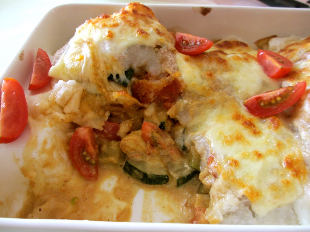 crêpes de riz, farine de riz, crêpes, crêpes de riz farcies,poulet, crêpes salées, plat complet, sans gluten, courgettes, crème de coco, pâte de curry, cuisine asiatique, tomates, mozzarella,gratin de crêpes