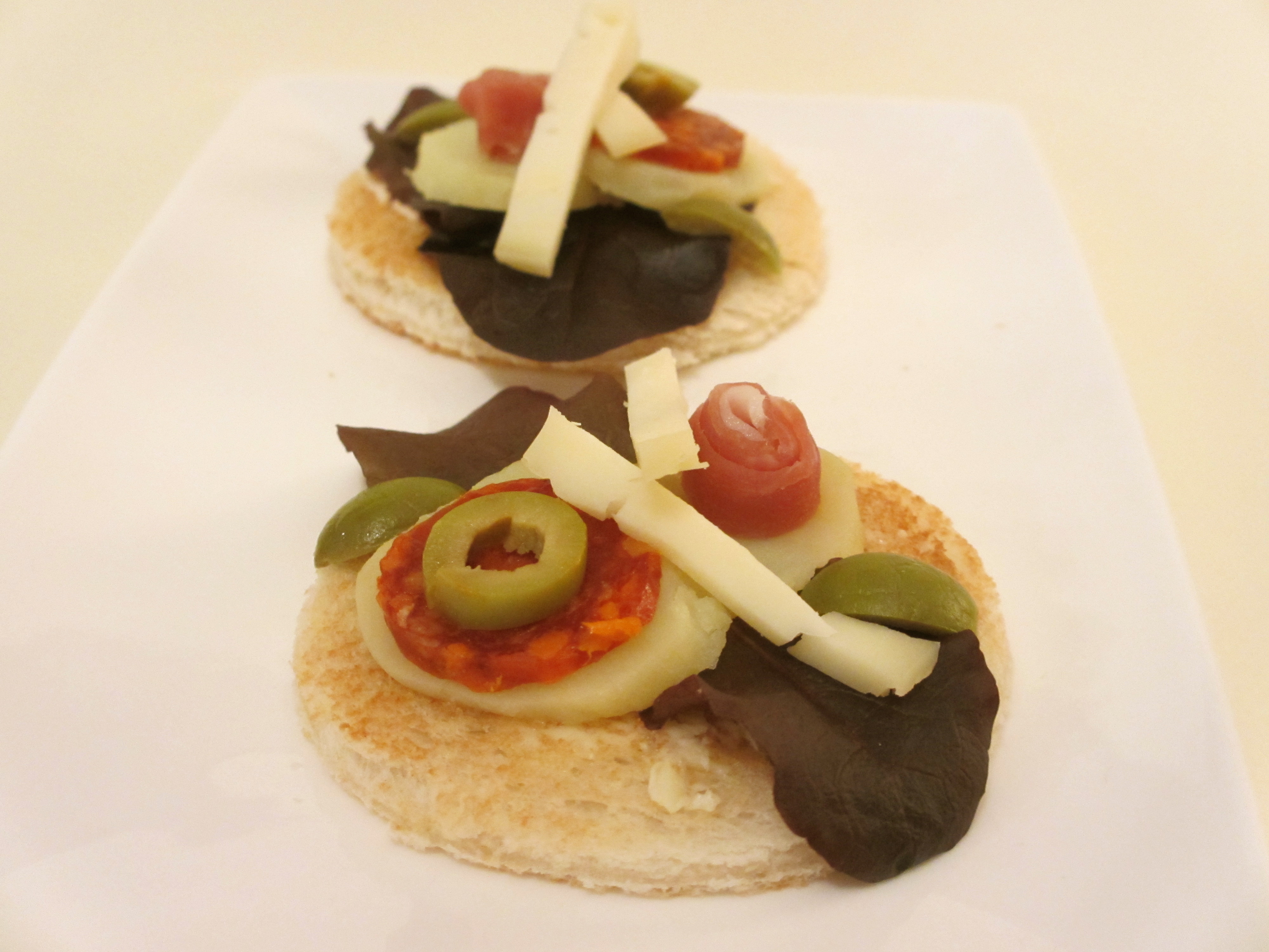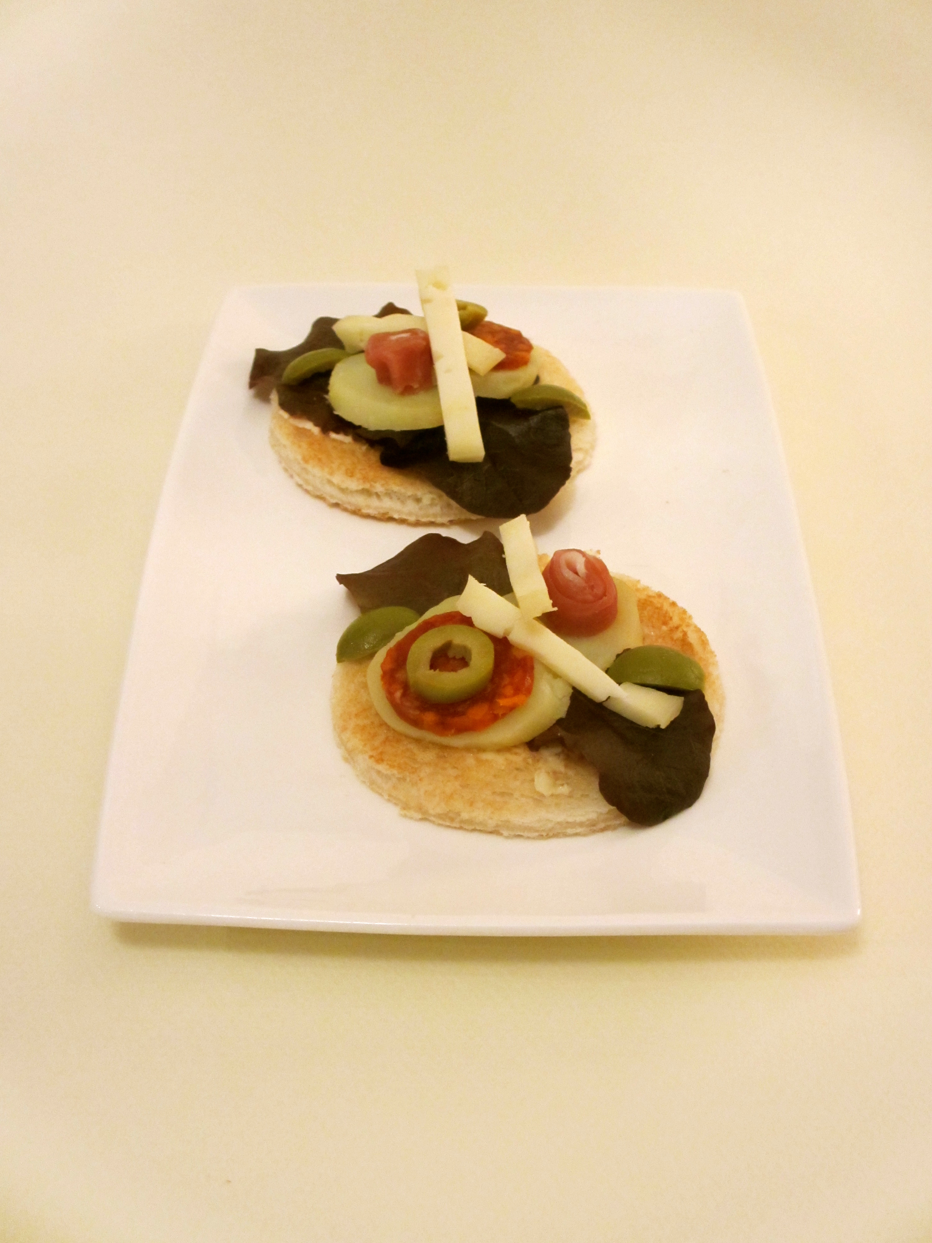 - Ajouter alors sur chaque tartine une rondelle de chorizo, 1/4 de tranche de jambon fumé roulé, des rondelles d’olives et deux bâtonnets de fromage de chèvre.