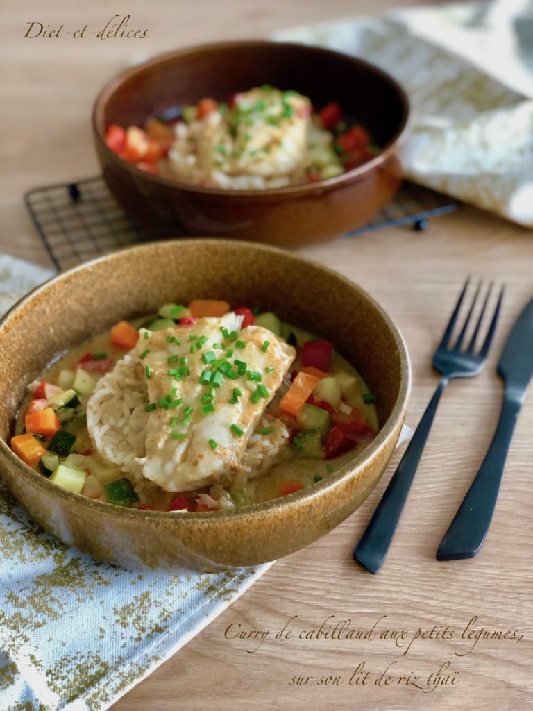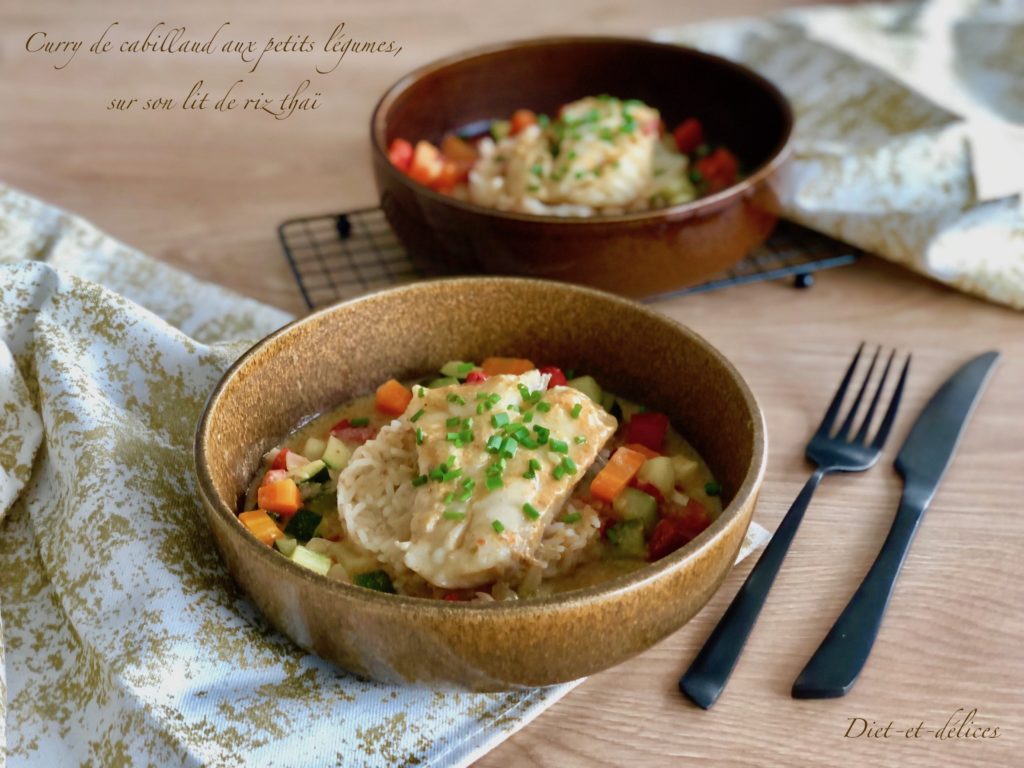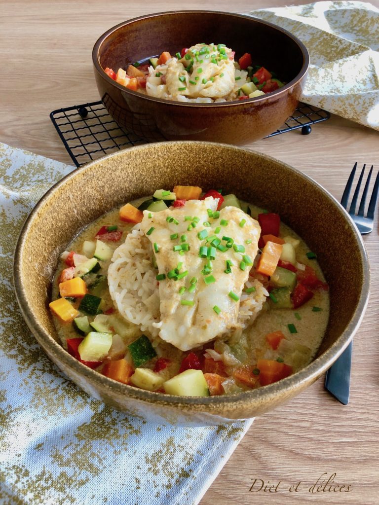 curry, curry de cabillaud, cabillaud, courgette, carotte, poivron, tomate, lait de coco, riz thaï