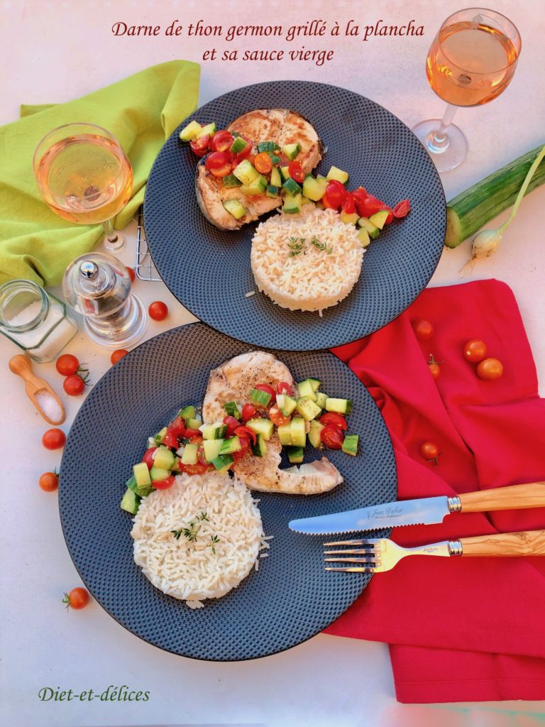 […] légumes sur une plancha bien chaude en remuant souvent avec une spatule. Courgettes à la plancha. Darne de thon germon grillé à la plancha et sa sauce vierge. Pour 2 personnes Temps de préparation : 10 minutes Temps de cuisson : 8 minutes Ingrédients : […]