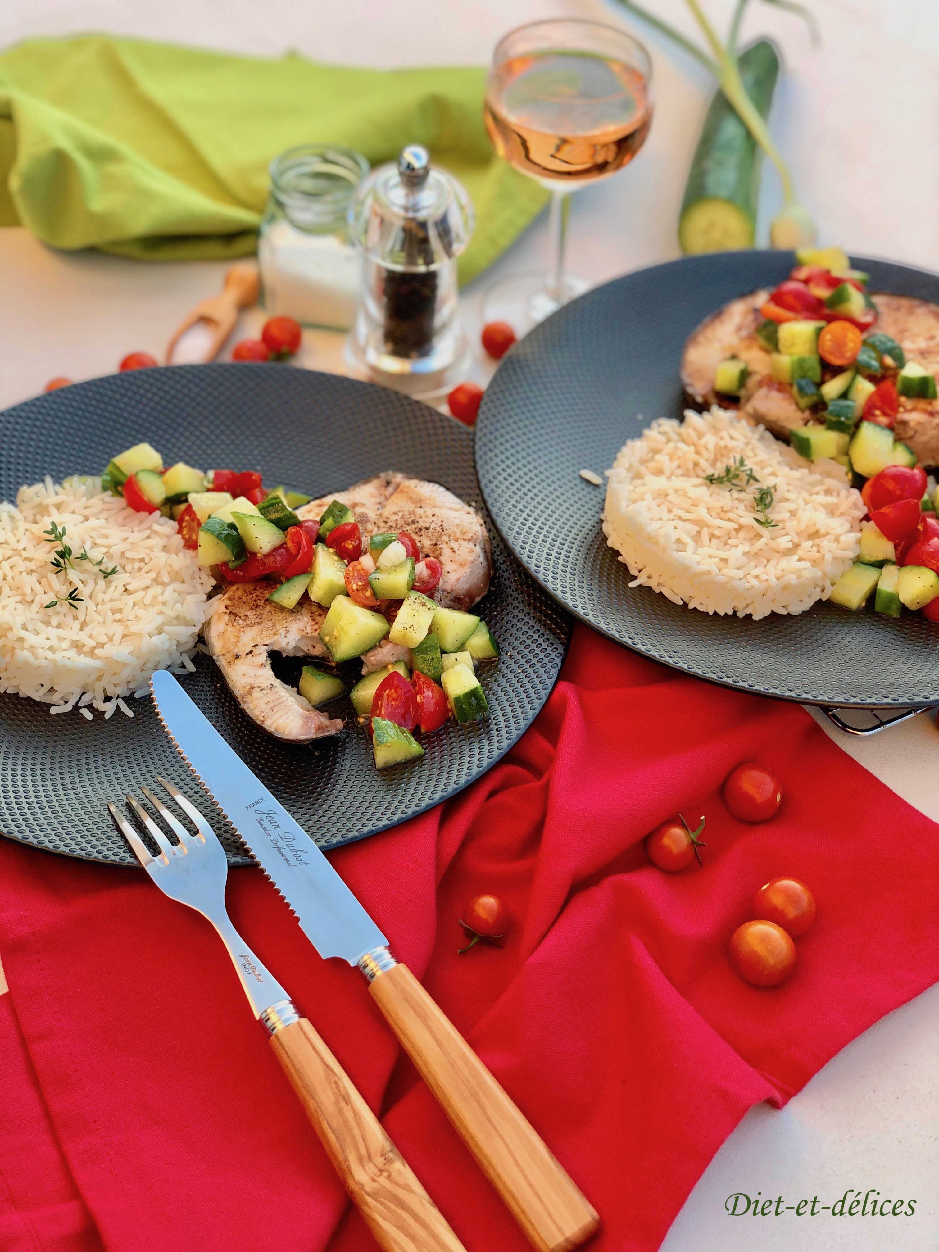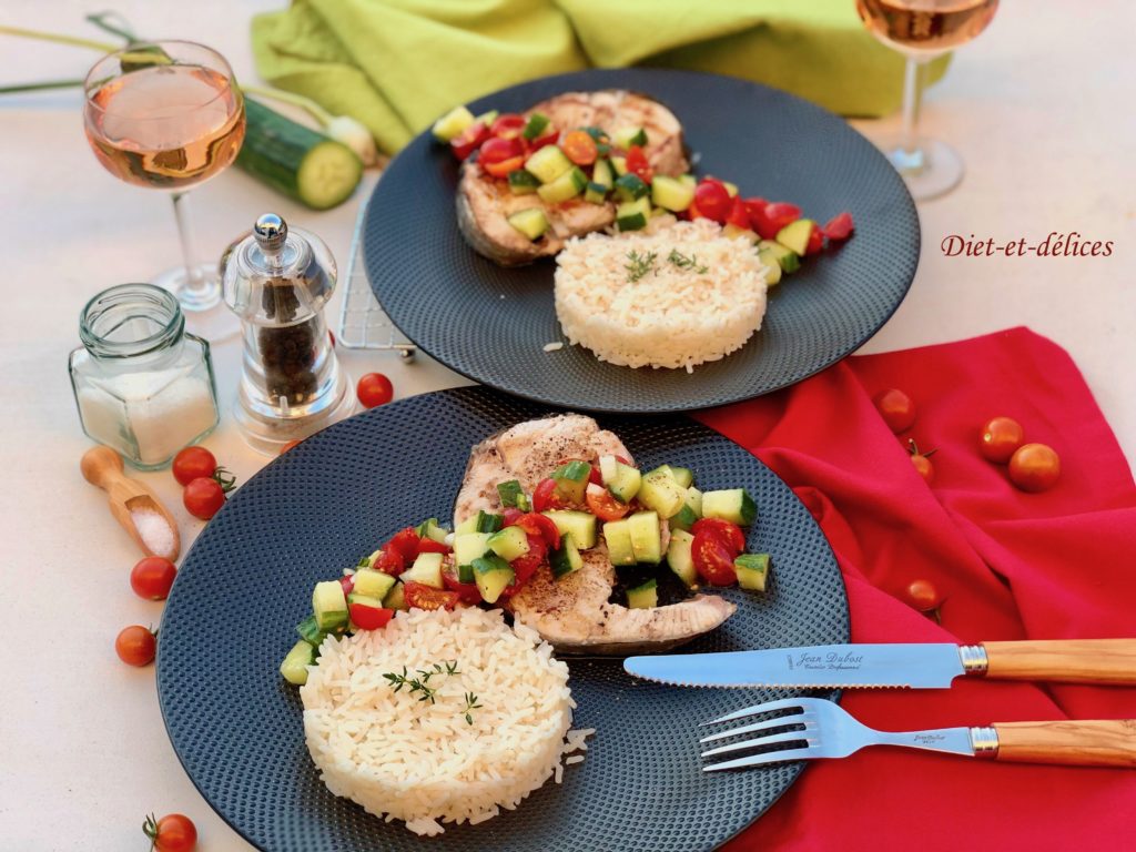 thon, thon germon, darne de thon , sauce vierge, tomates cerises, concombre