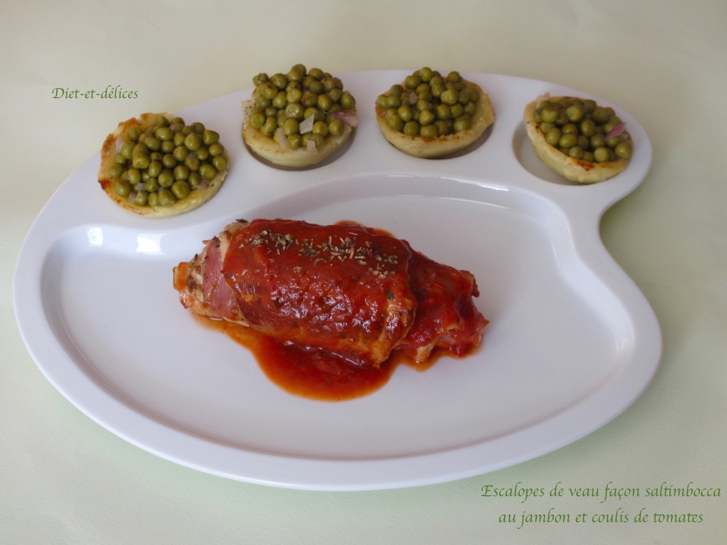 veau, escalope de veau, jambon, veau façon saltimbocca, escalope de veau façon saltimbocca, jambon fumé, coulis de tomates, tomates, origan, viande, cuisson rapide, ail