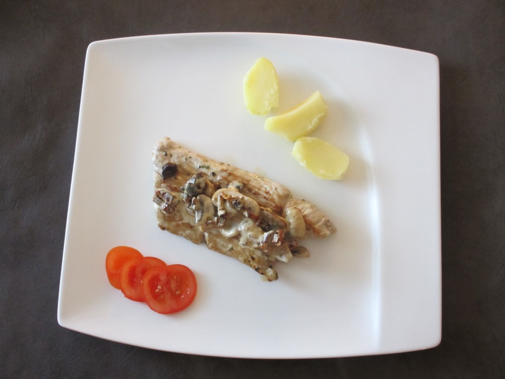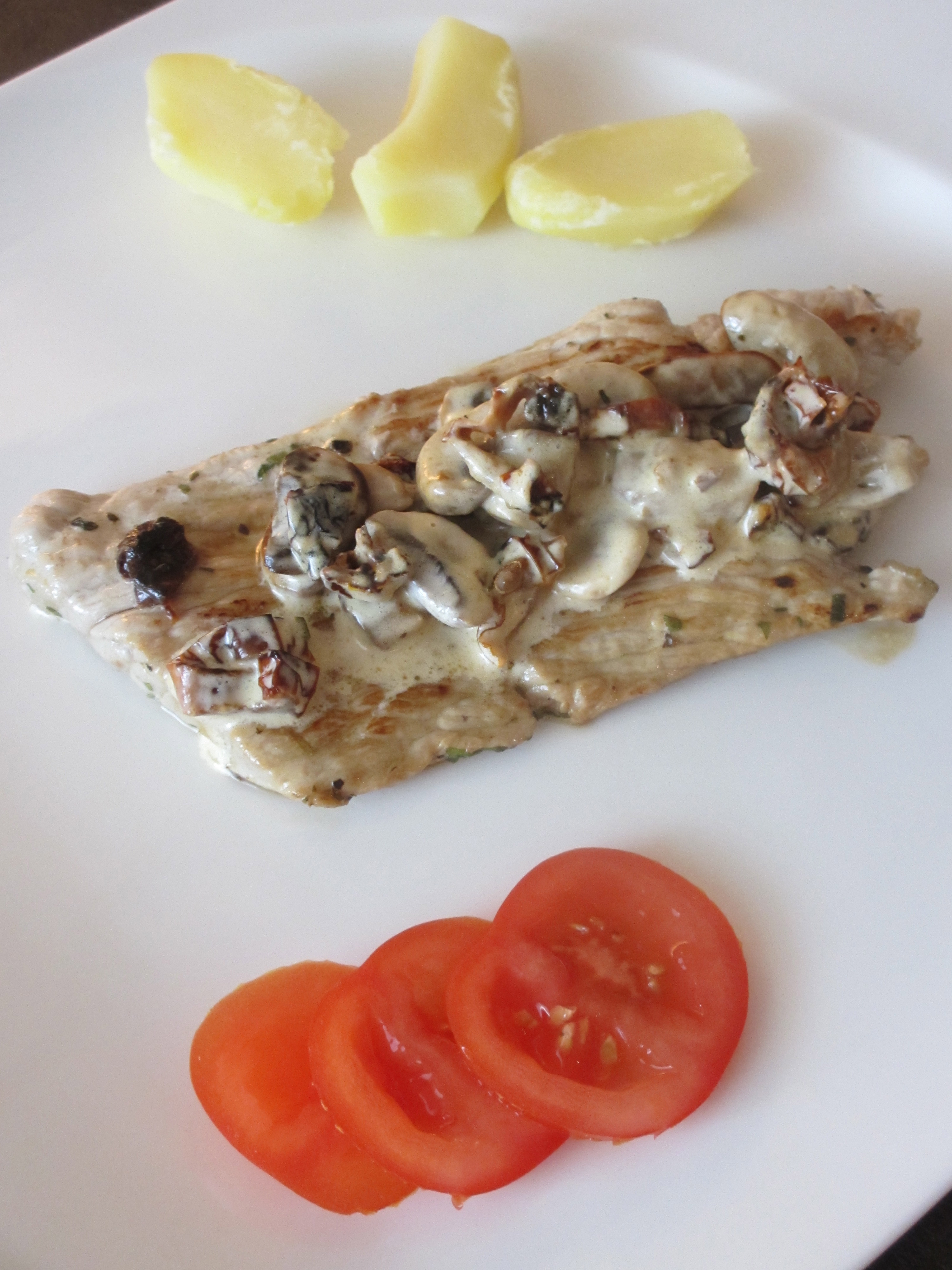 escalope, veau,escalope de veau, tomates séchées, huile au basilic, huile d’olive, champignons,champignons de Paris, crème