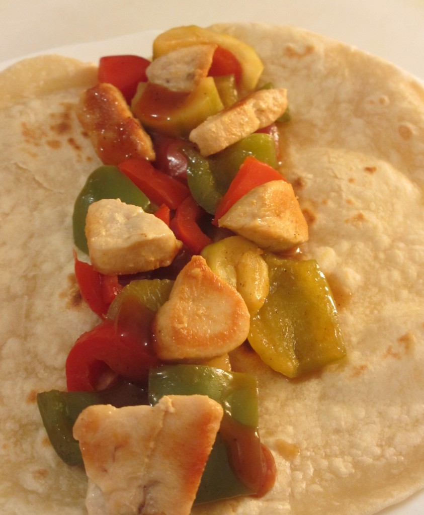 - Dans les tortillas, déposer le mélange de légumes, ainsi que quelques morceaux de poulet. Rouler les tortillas.