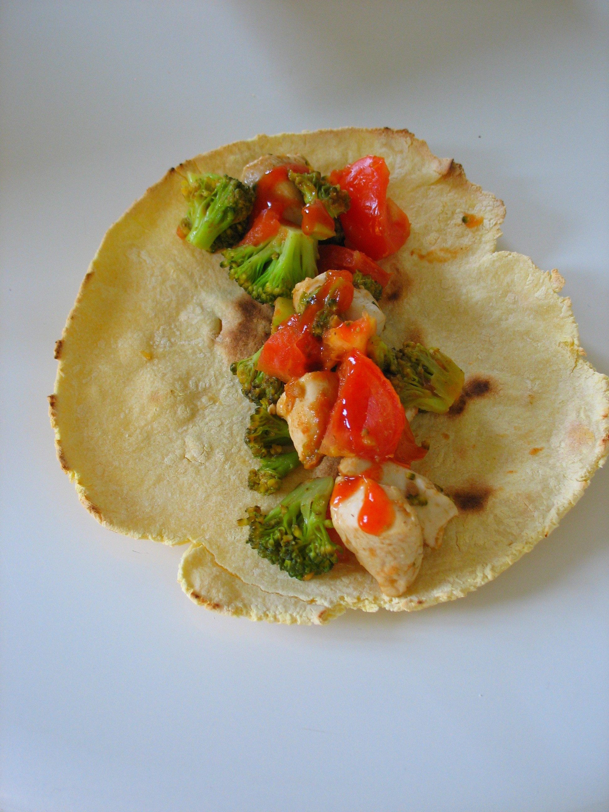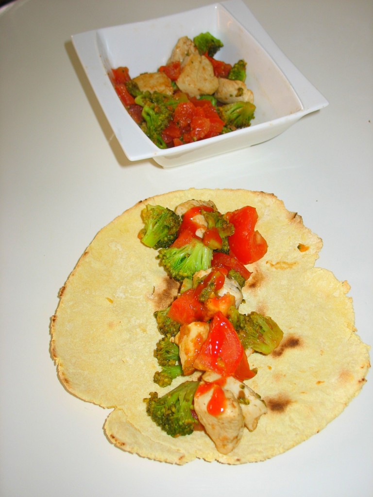 – Cette recette constitue un plat complet : une portion de viande avec le poulet, une portion de légumes (brocolis et tomate) et une portion de féculent (tortillas).