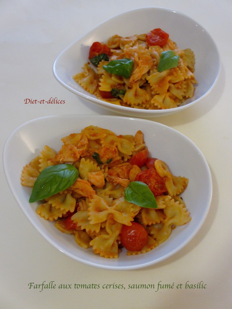 pâtesfarfallesaumon,  pâtes au saumonfarfalle au saumonsaumon fumé,  pâtes au saumon fuméfarfalle au saumon fumétomates cerises,  pâtes au saumon fumé et tomatescoulis de tomatesbasilic,  poissonplat completpasta
