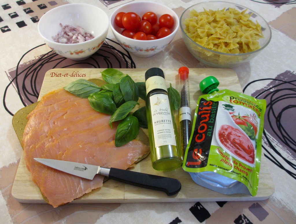 farfalle, pâtes, saumon, saumon fumé, coulis de tomates, basilic, pâtes au saumon, pasta, tomates cerises, échalote, huile d’olive